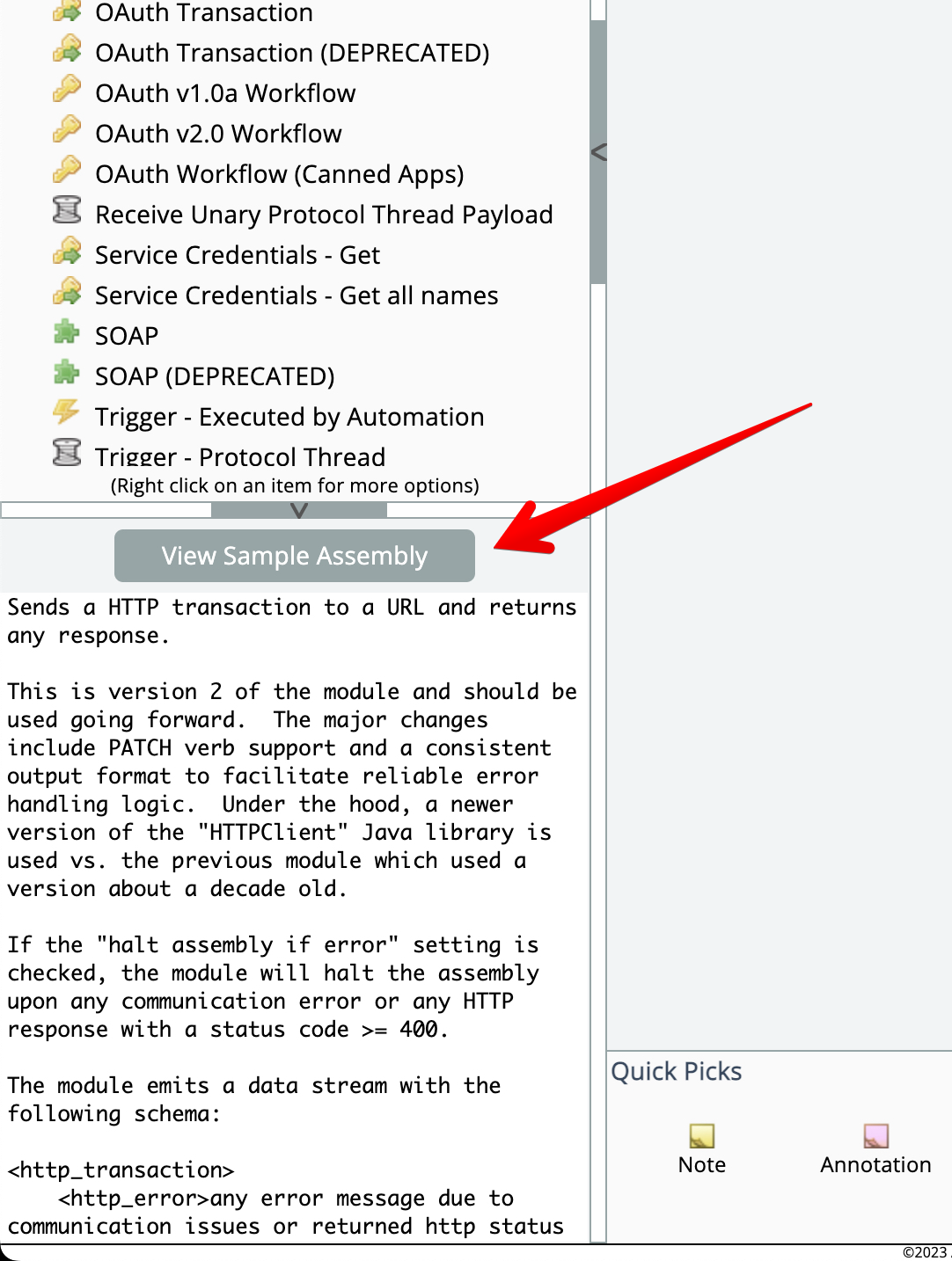 When a sample assembly is linked to a module, the module's help information will include a button to open the sample assembly: