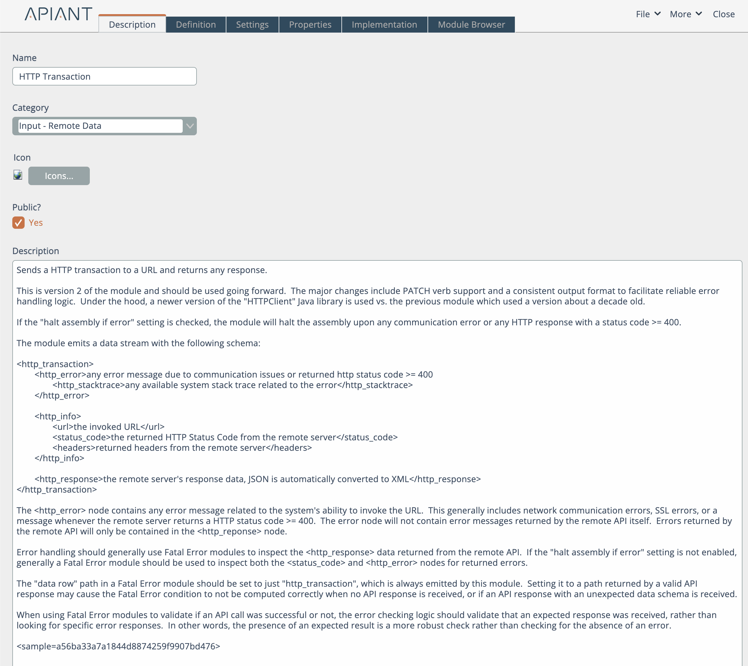 This tab describes the module's catalog entry: