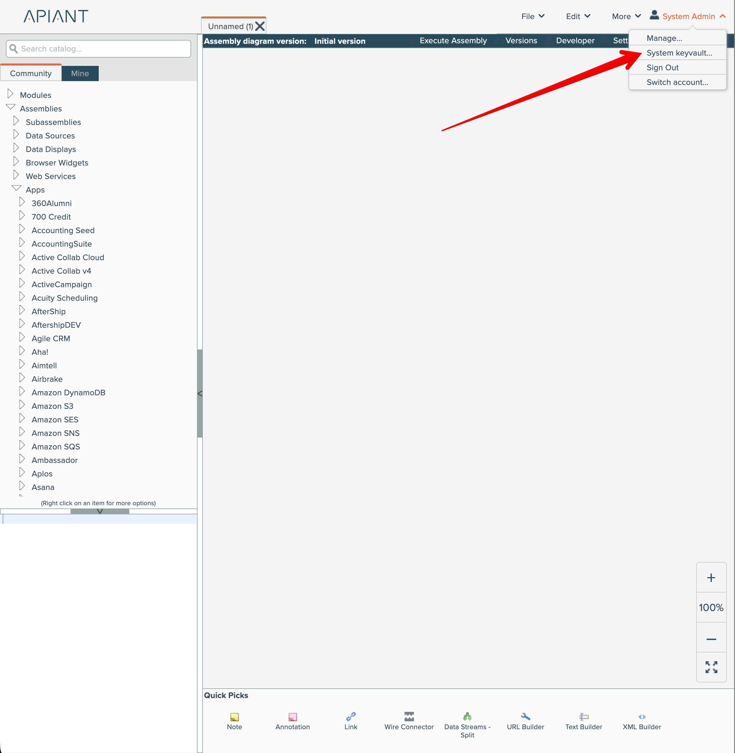 The keyvault can also be accessed from the Assembly Editor's account menu at the top right: