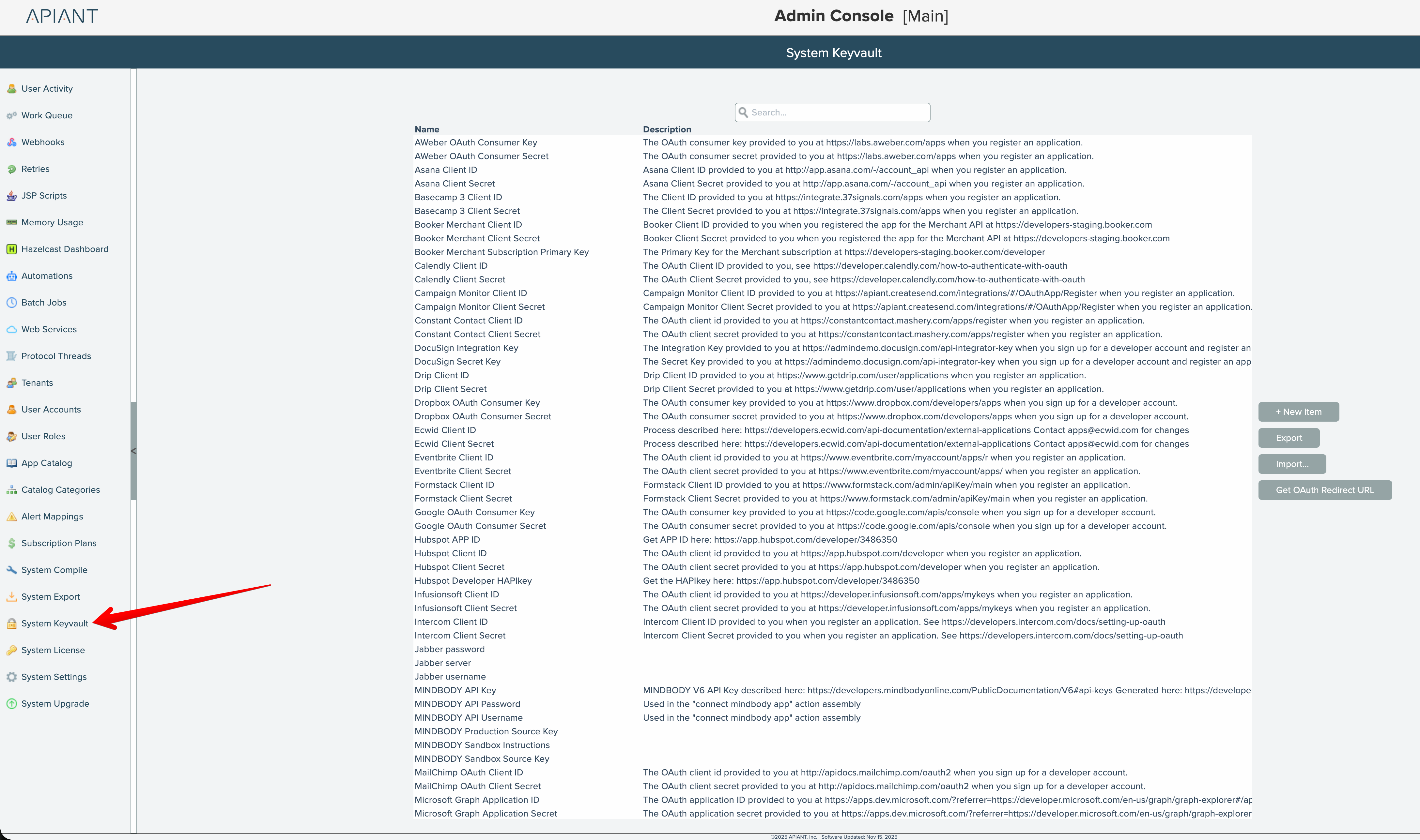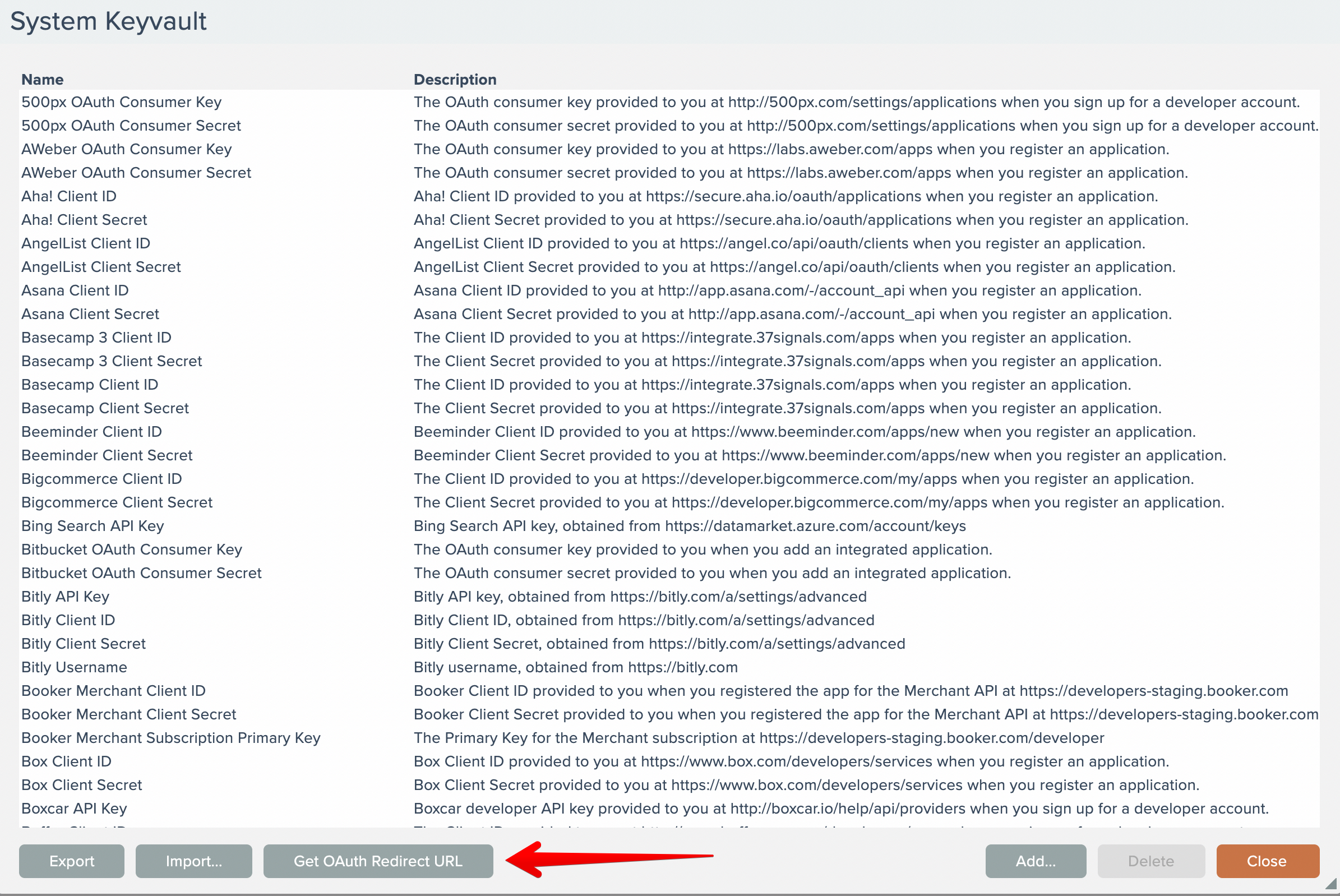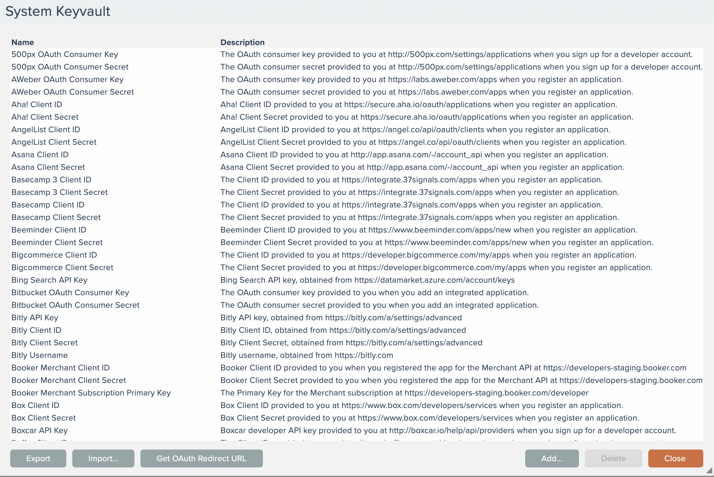 The System Keyvault dialog provides functionality to add/edit/remove items and to export/import all items in the keyvault:
