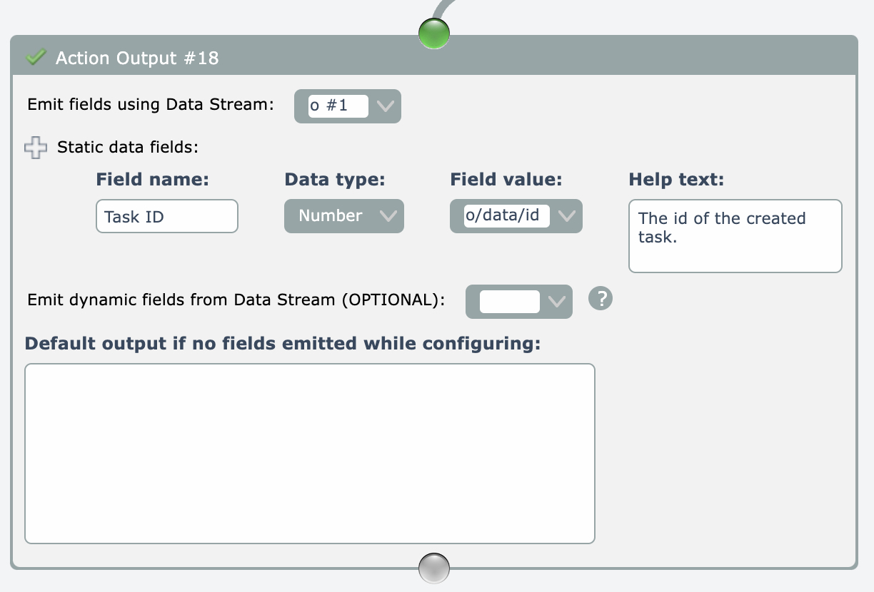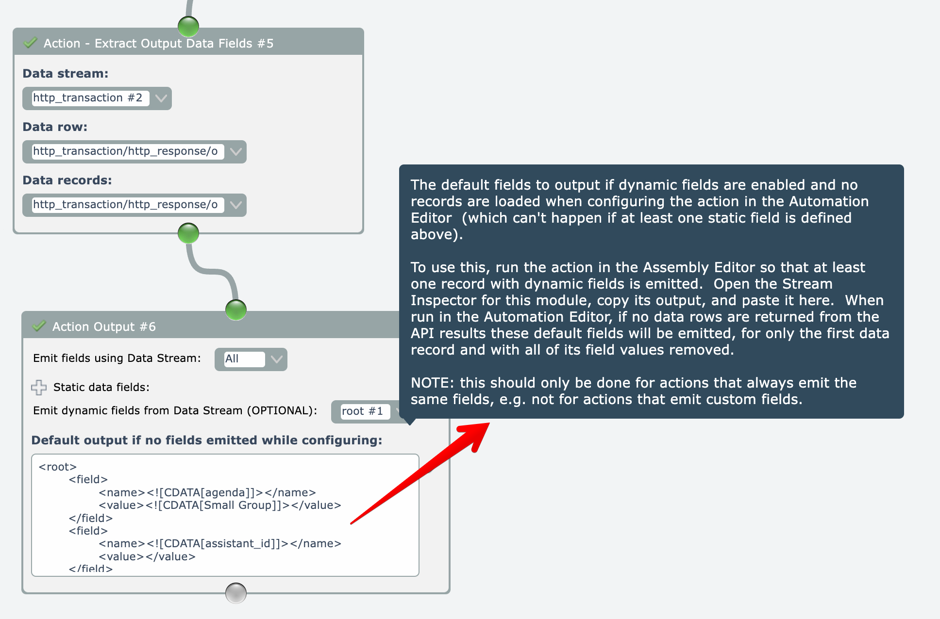 For actions that only emit dynamic output fields, in most cases you will want to define default output fields in case the action logic is unable to fetch an API record at the time the action is configured in the automation editor. Review the help info about default output by mousing over the default output field in the module: