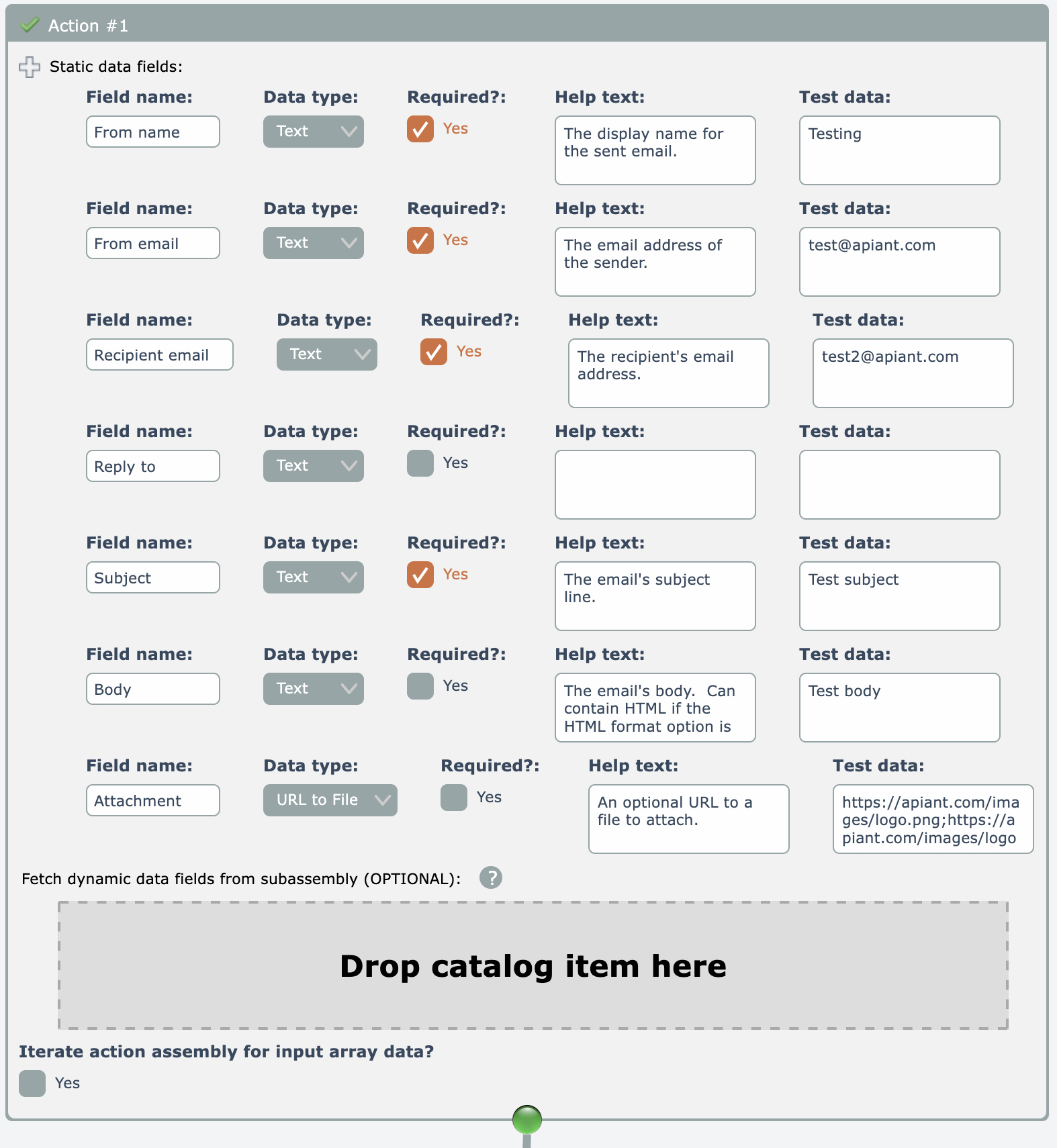 Static input data fields can be typed into the module and configured manually. Generally this is only done when the action has a relatively small number of input fields.
