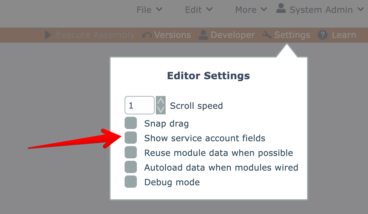 By default the Assembly Editor's settings has the "show service account fields" setting disabled: