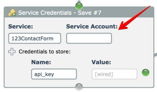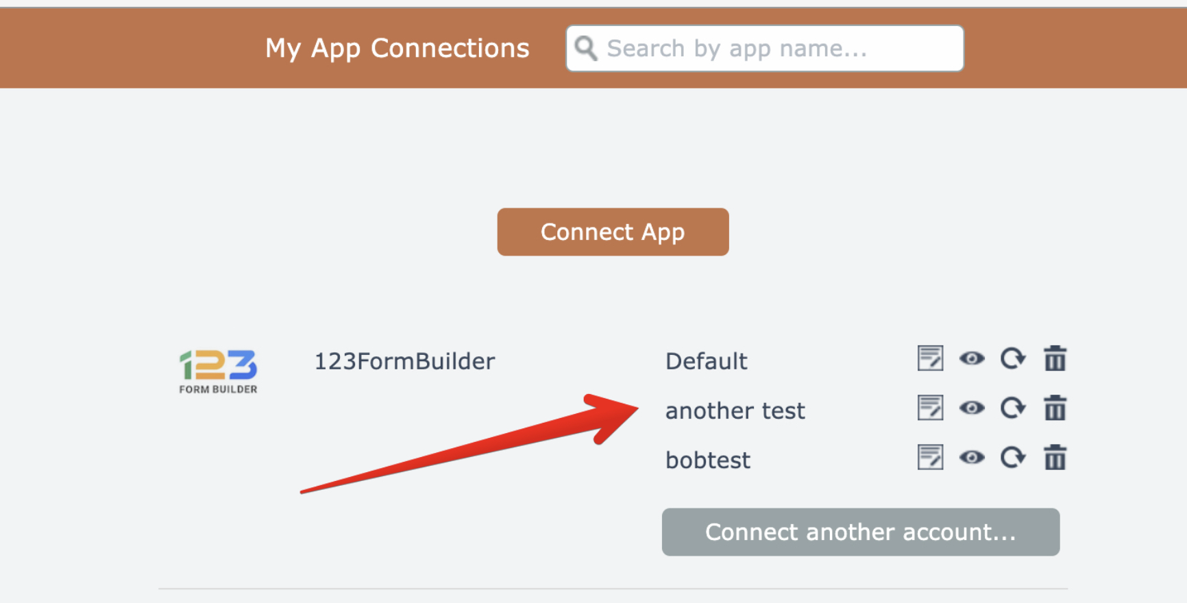 So the above 123FormBuilder app has 3 service accounts named "Default", "another test", and "bobtest".