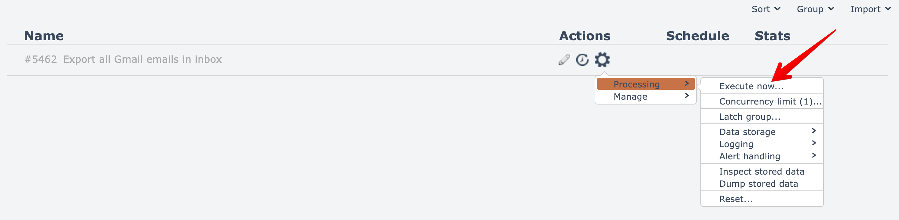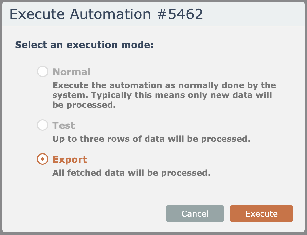 Export automations that have an export trigger appear differently in the automation editor's dashboard. They have no on/off switch and can only be executed manually: