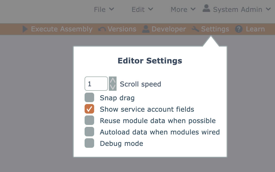 Learn about the different settings available in the assembly editor menu, including scroll speed, snap drag, and service account field display. Discover debugging options such as reporting execution errors, module execution timing, debugging nested module