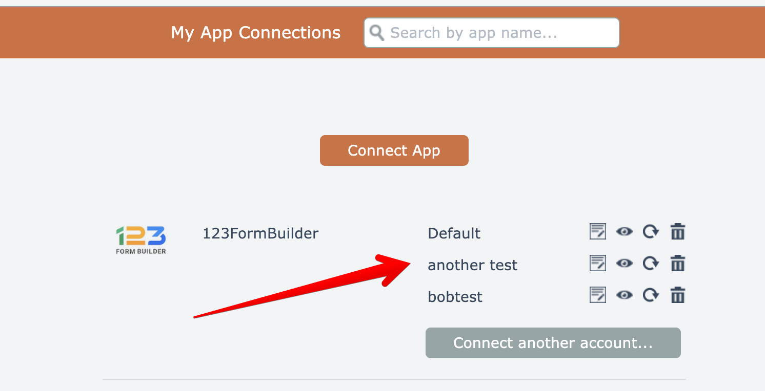 So the above 123FormBuilder app has 3 service accounts named "Default", "another test", and "bobtest".