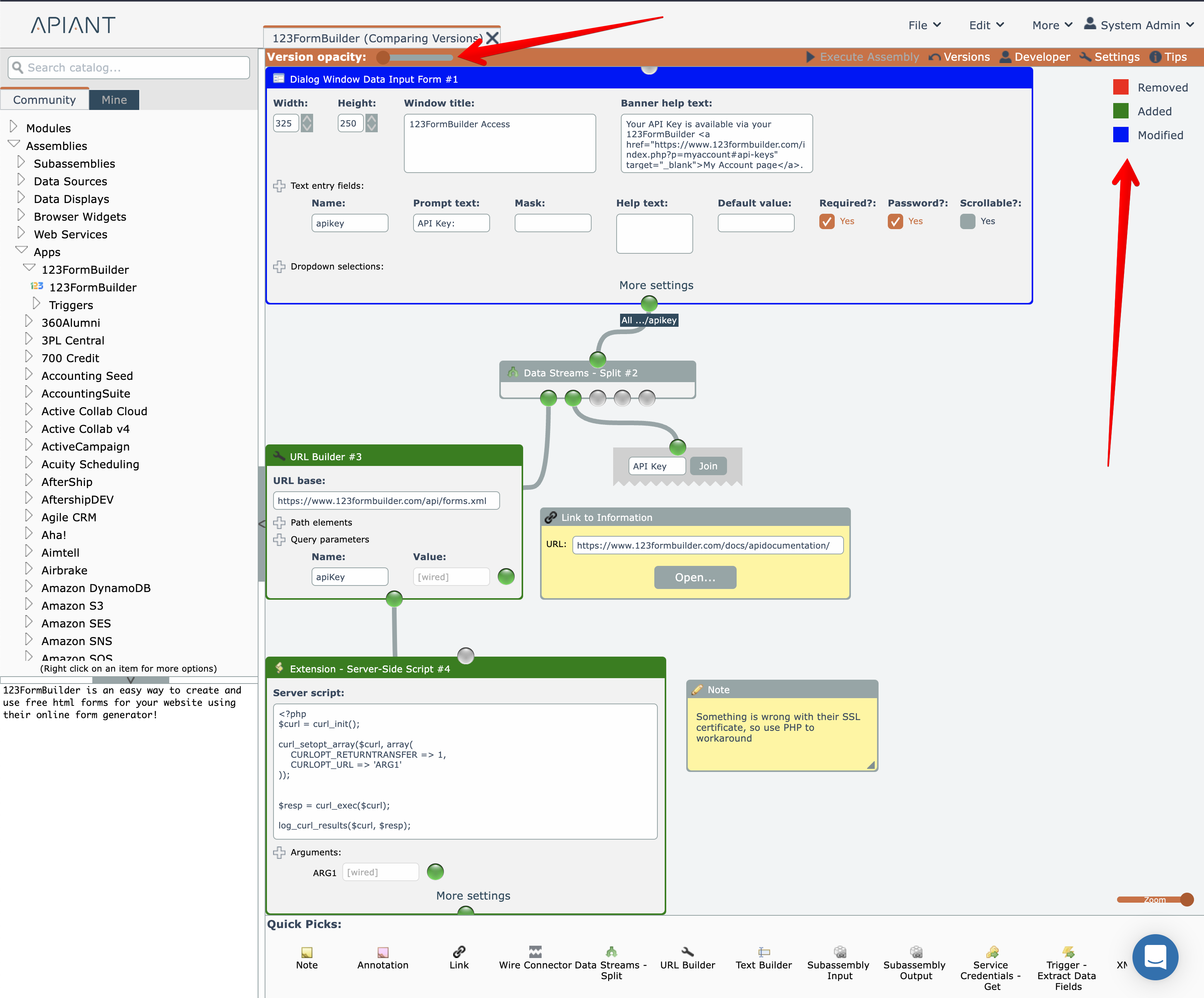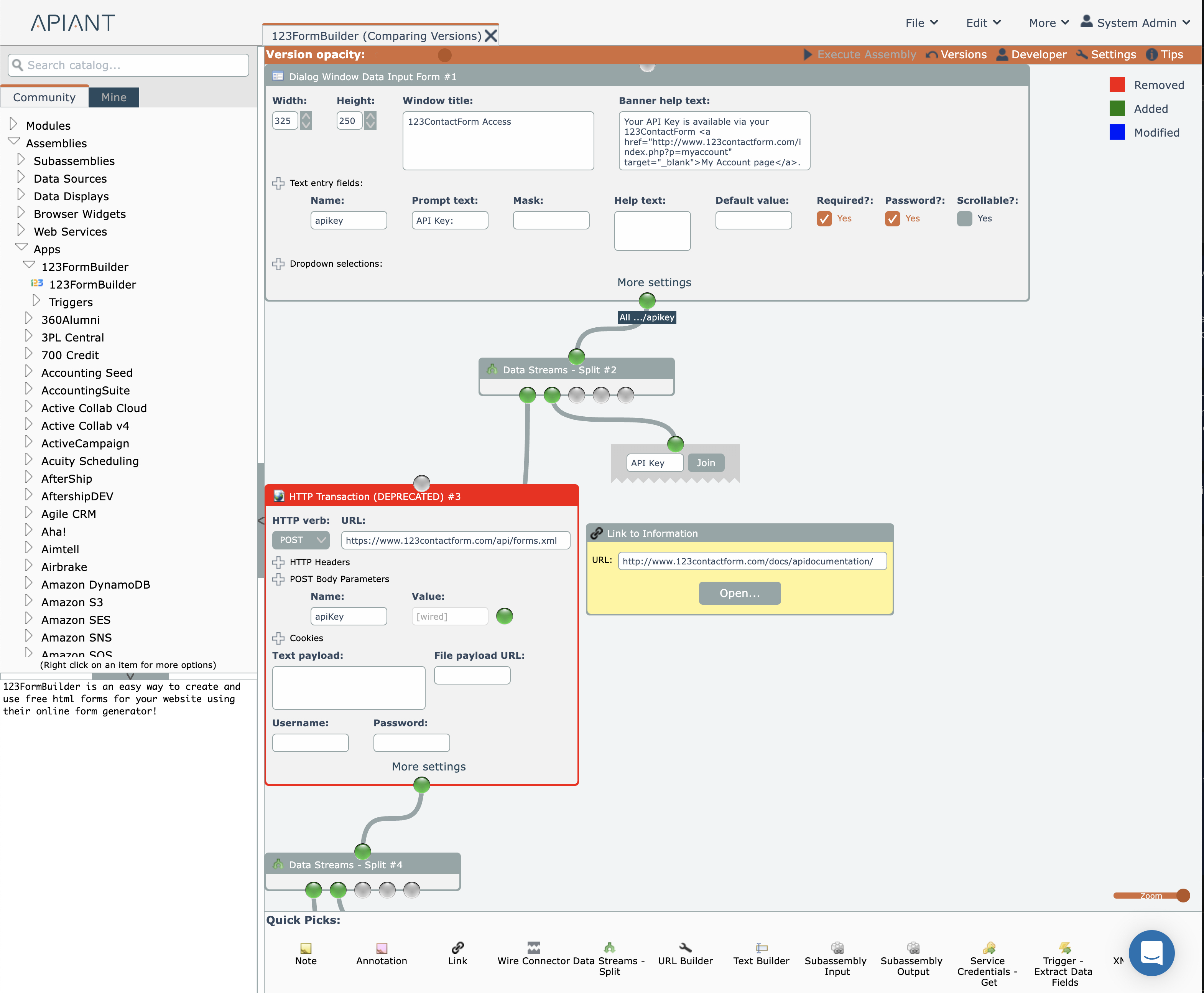 Here in these two screenshots is 123FormBuilder. The above screenshot is the latest version. In the oldest version below, you can see the app was originally named 123ContactForm and that a HTTP module was used to make an API call instead of the PHP code being used now.