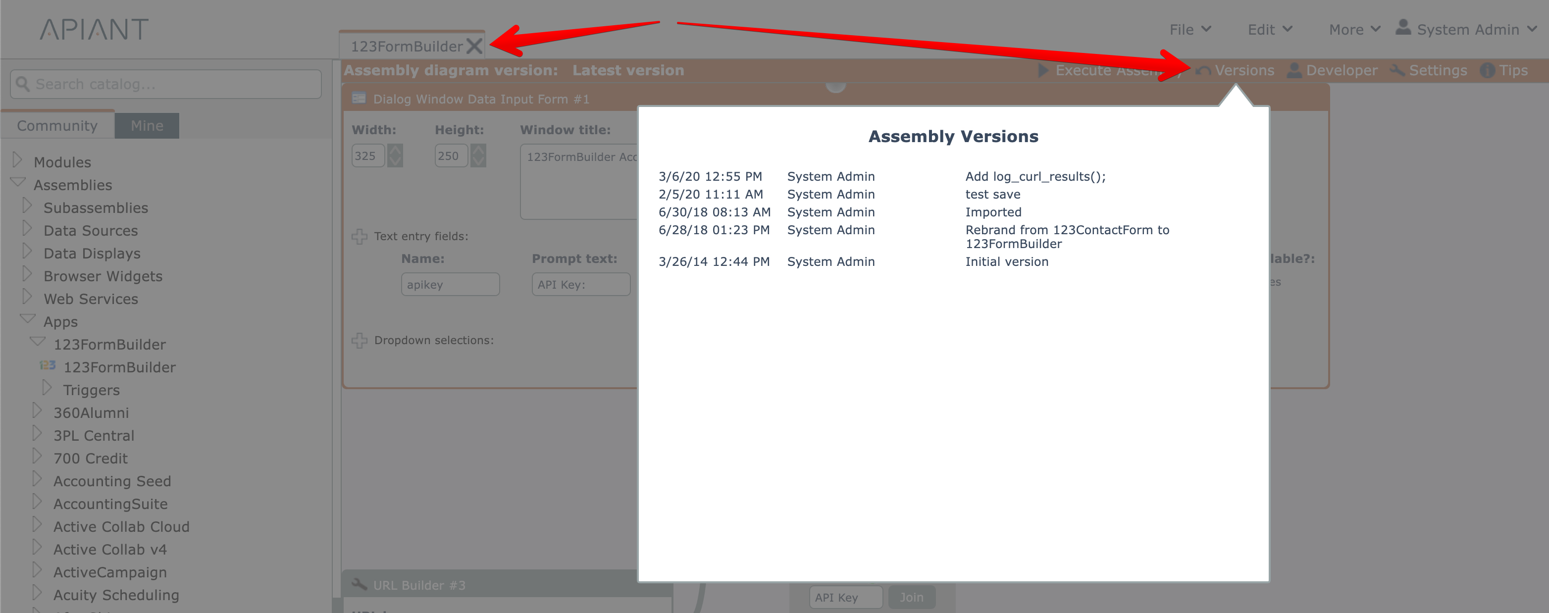 To view version history for an assembly, open it in the editor then click the Versions menu option at the top right: