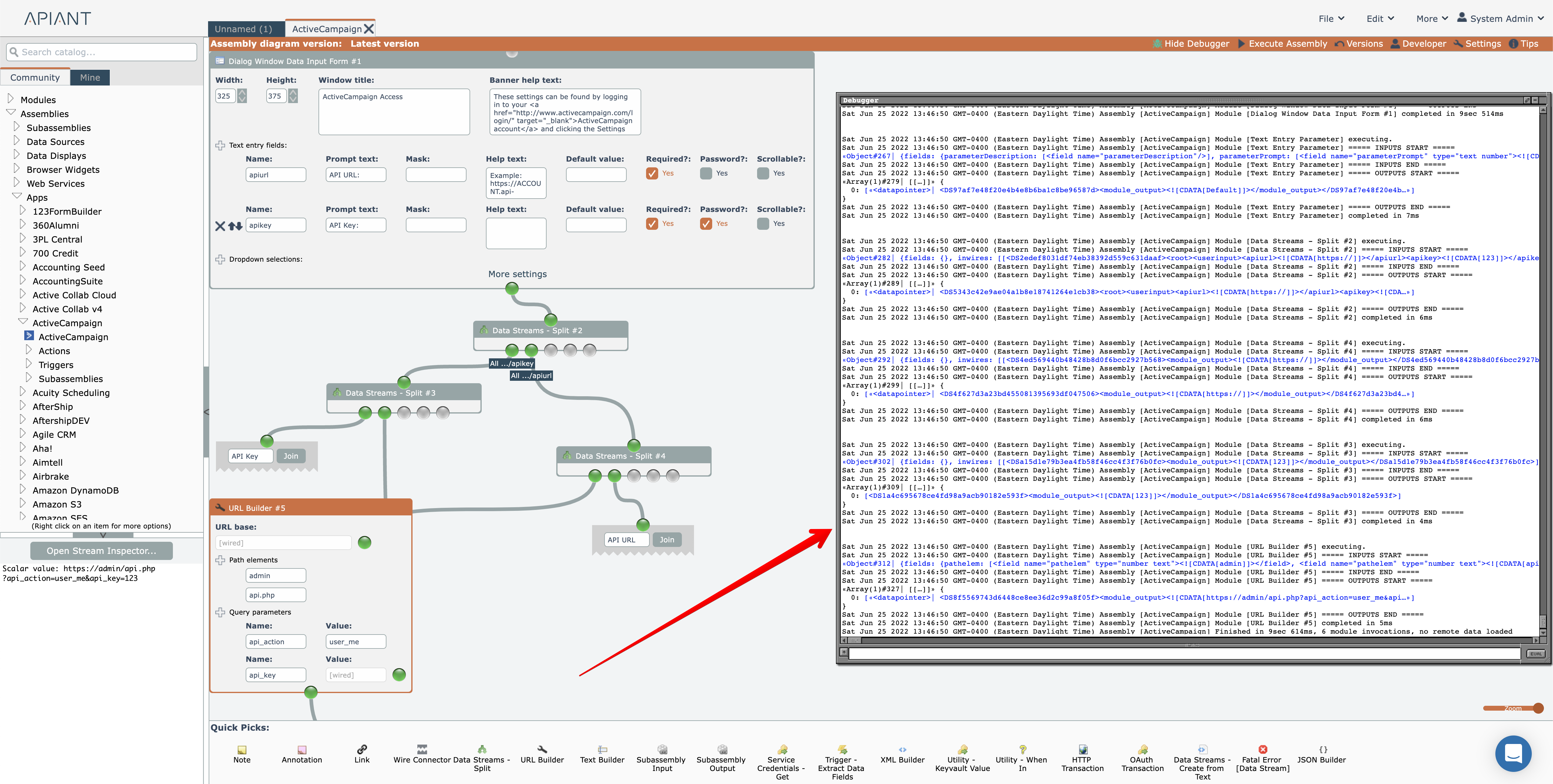 Modules that have debug logging enabled (see Logging) will write information into the debug window when the assembly executes: