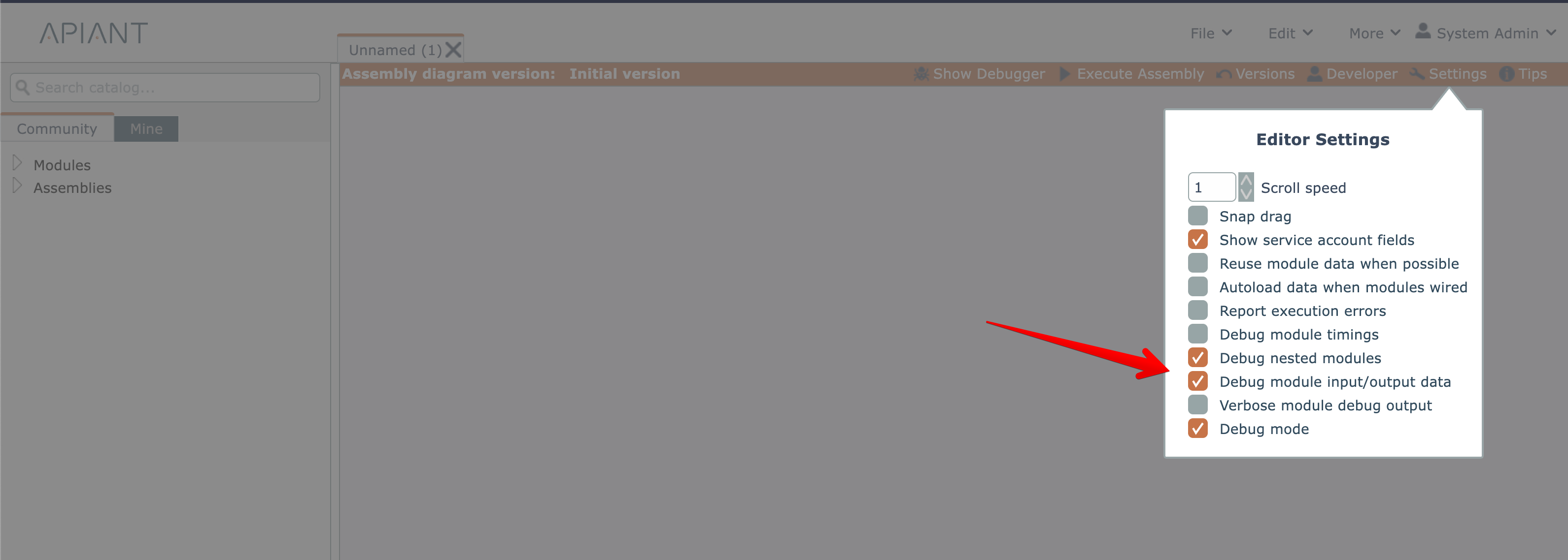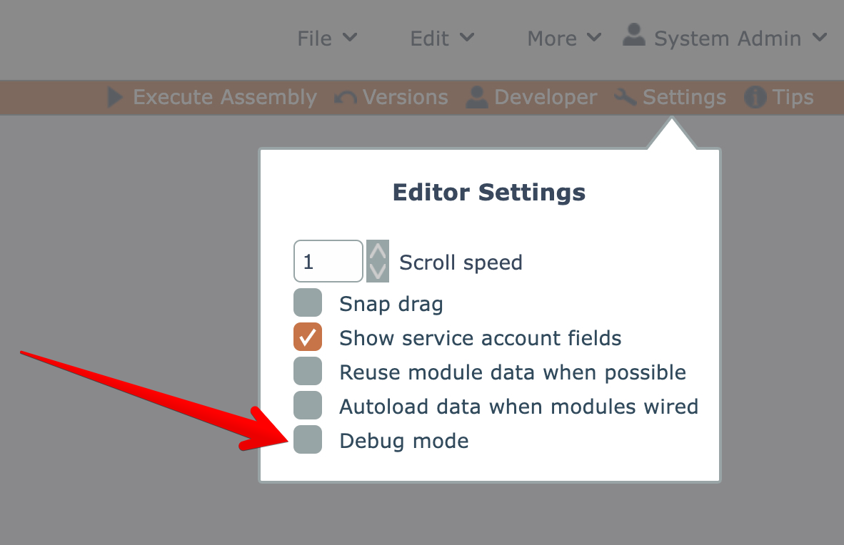The assembly editor can be put into debug mode via this settings checkbox: