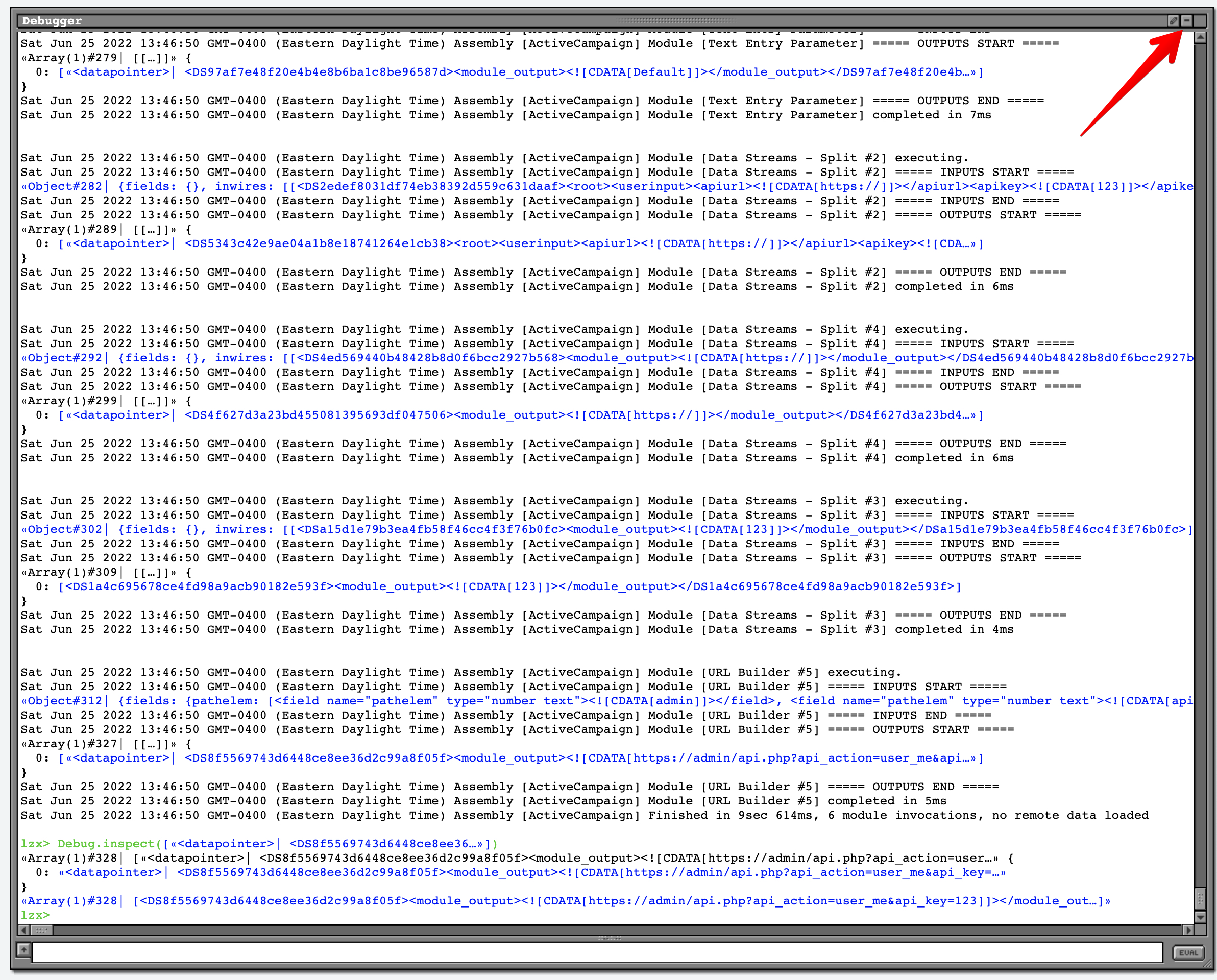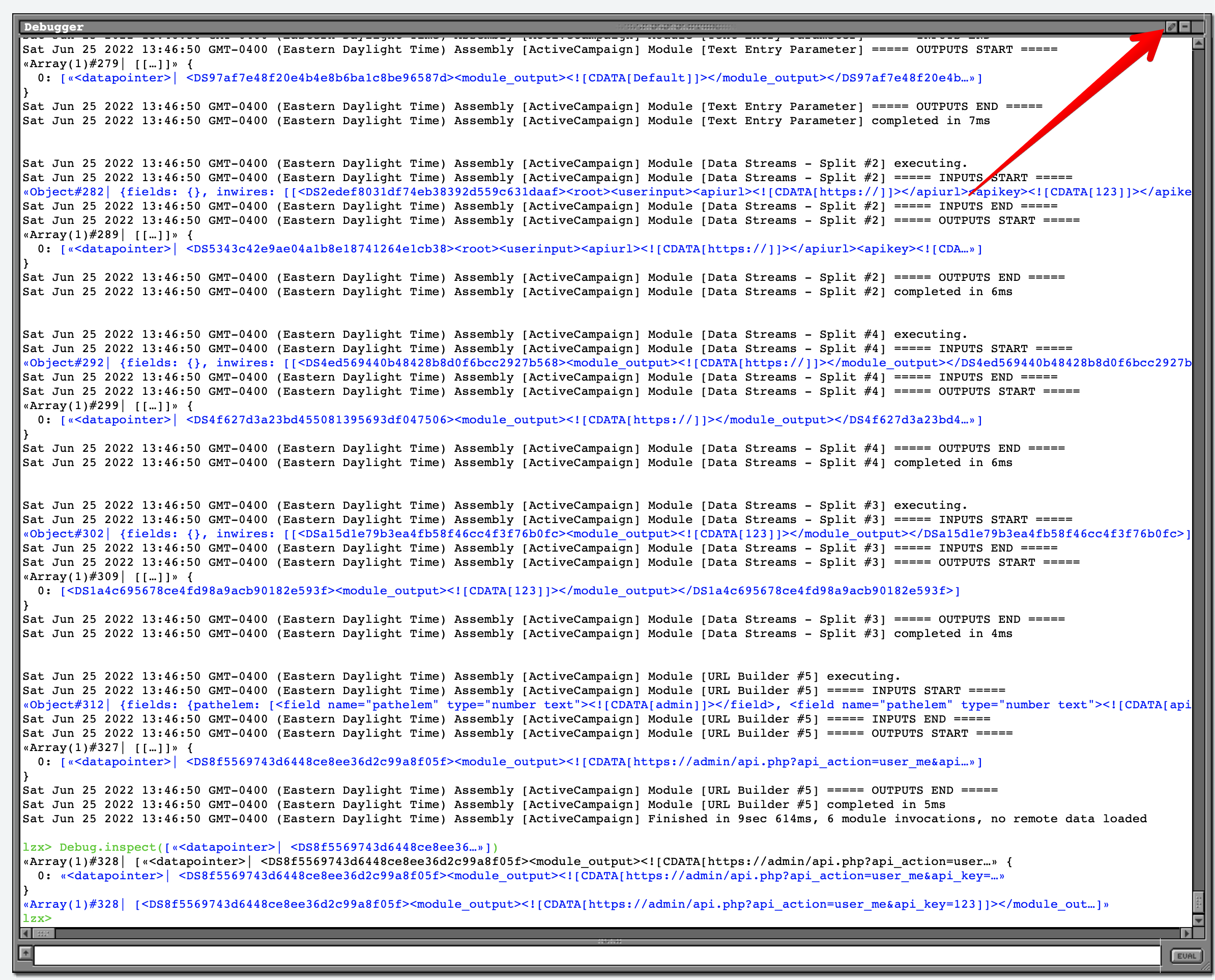 Blue links in the debug window can be clicked to drill into the data.