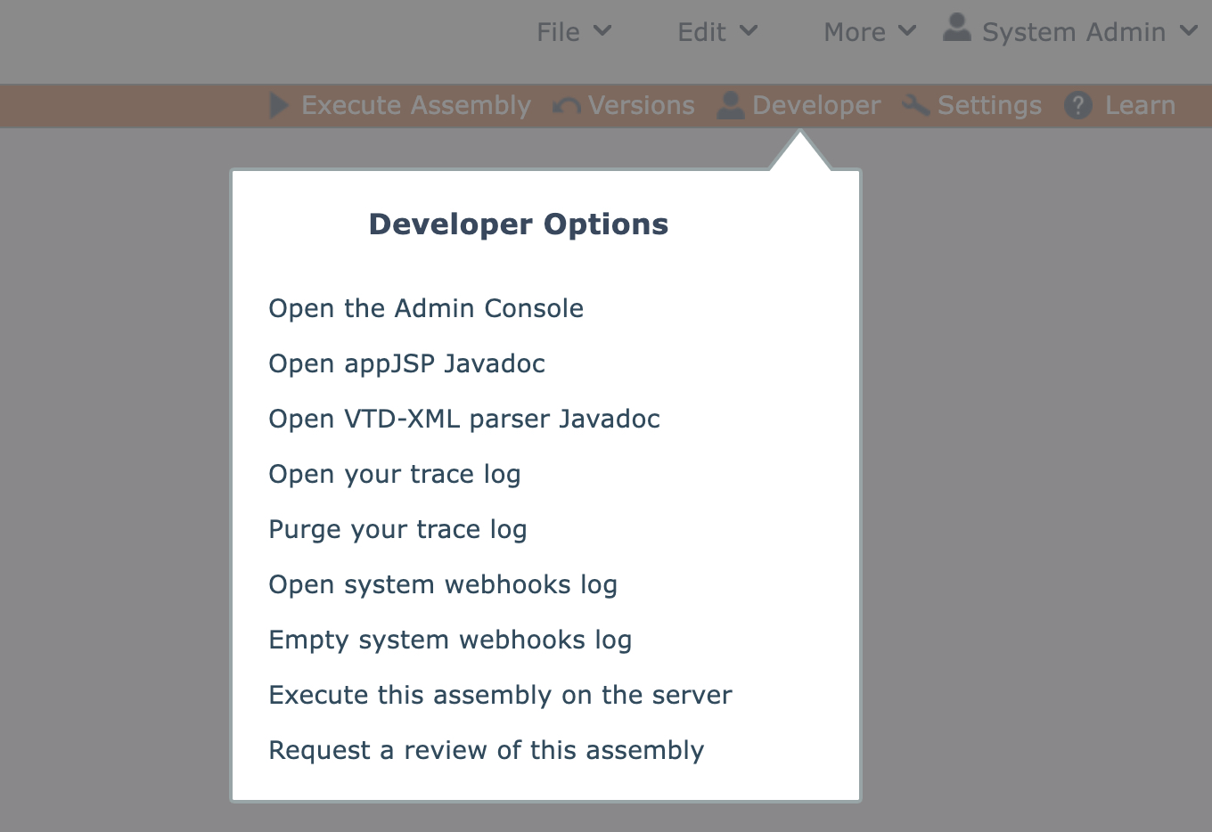 Learn how to use the developer menu to streamline the development and review process for assemblies. Access the Admin Console, Javadoc for appJSP and VTD-XML parser, trace log viewer, system webhooks log, server execution, and assembly review request all
