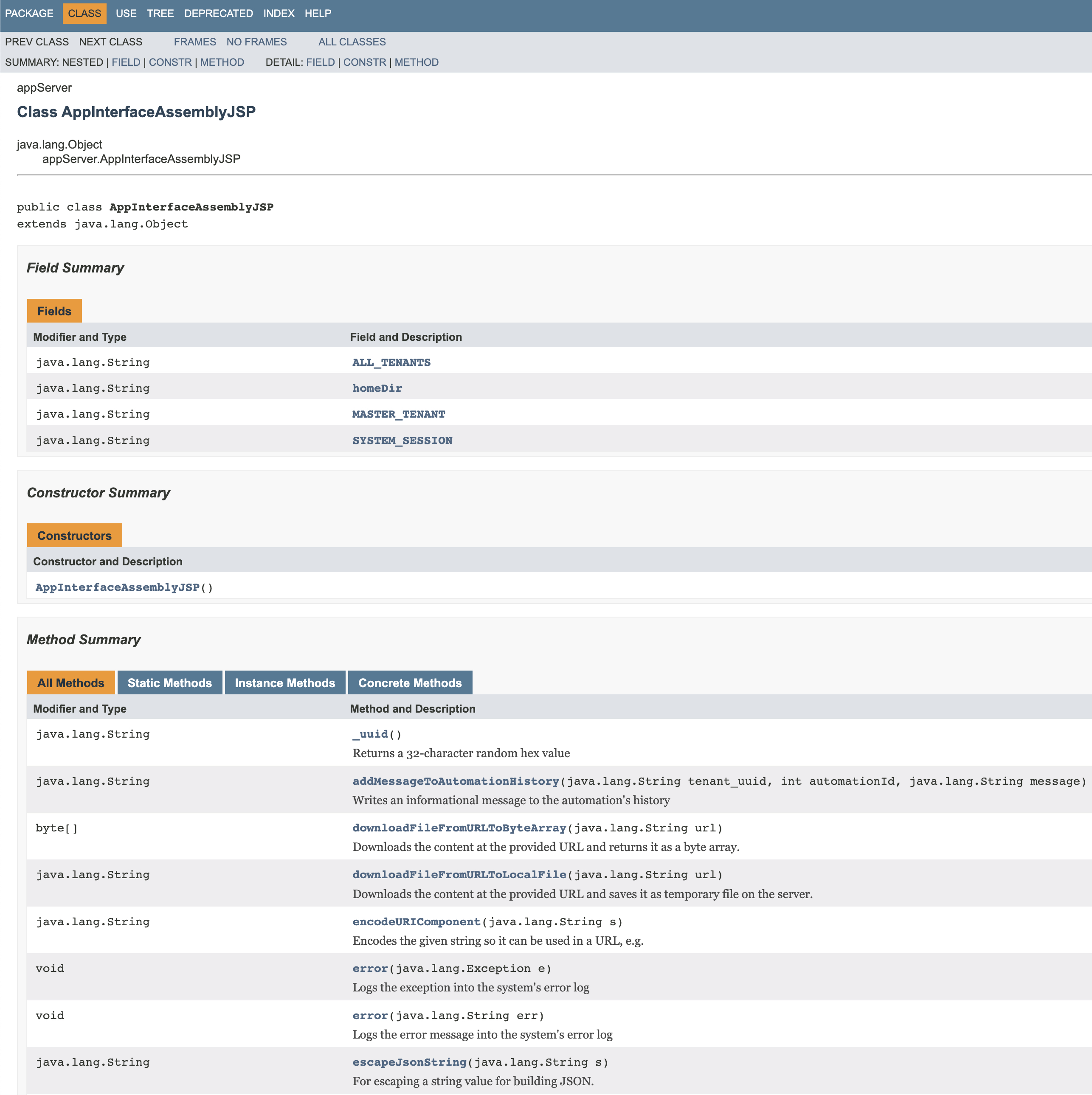 Within the inlined Java JSP code, the "appJSP" bean class (defined by default in the module's skeletal Java JSP code) is used to access various functionality.