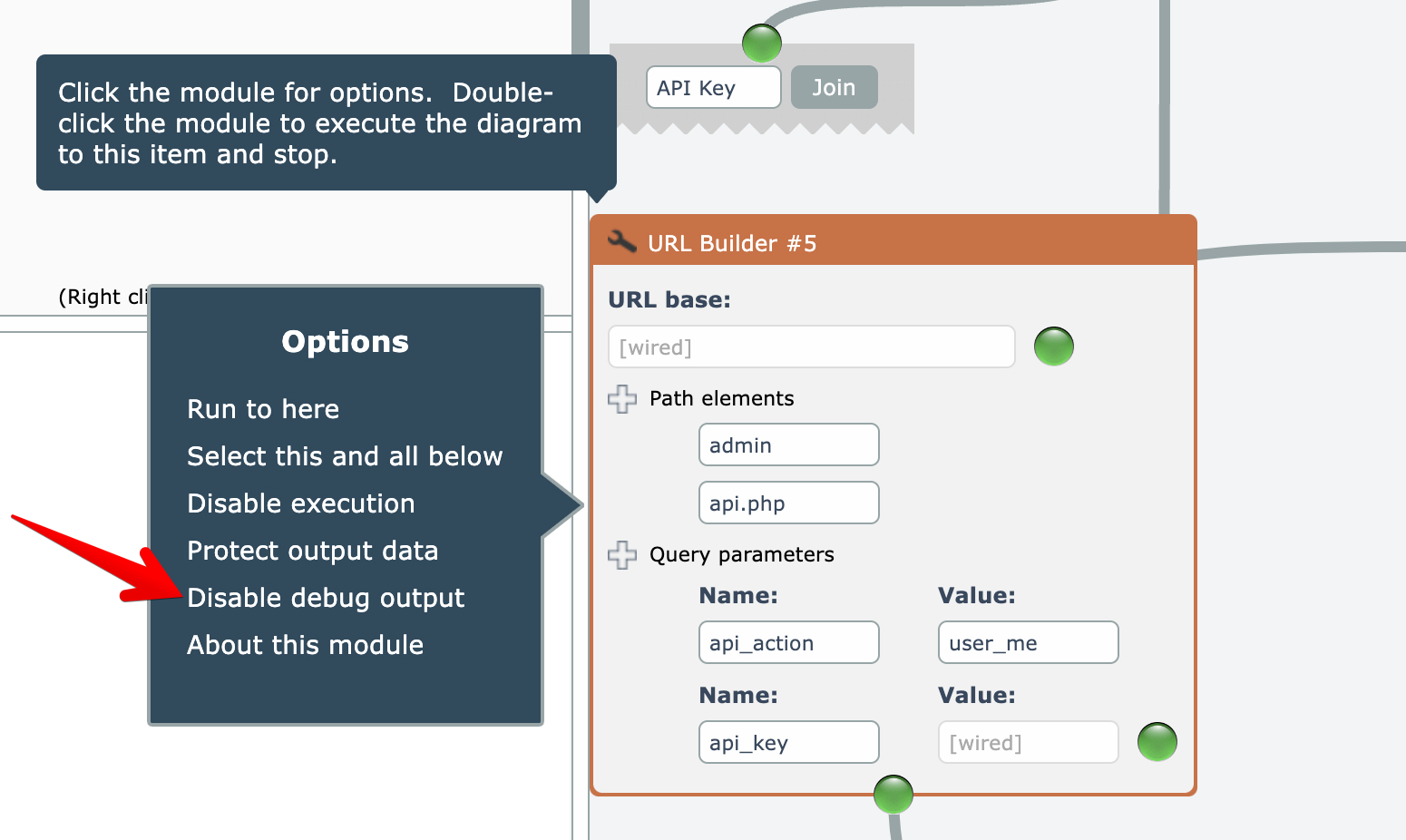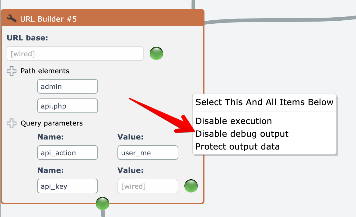 To turn off debug logging for all items in the diagram, right-click on the editor's background and choose the "disable all debug output" menu option: