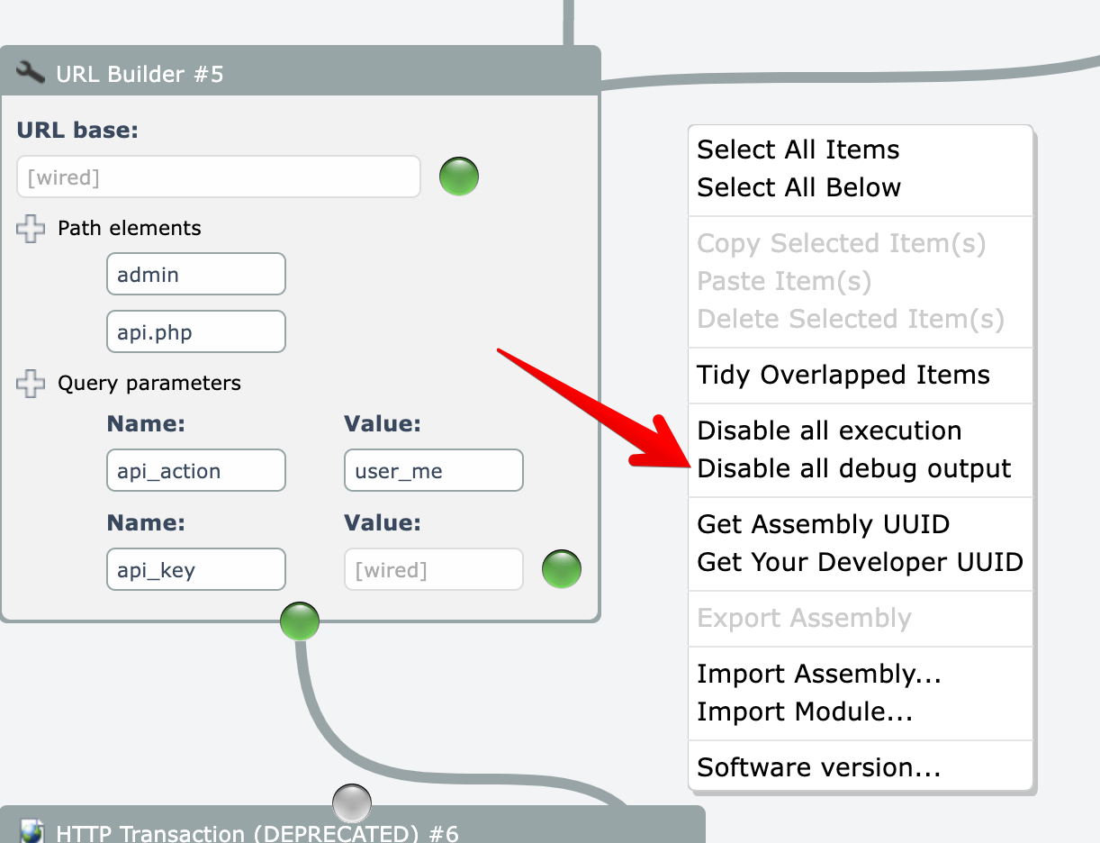 As assemblies are executed, each module can write debug information into automation logs (see Viewing item details in history) or the assembly editor's built-in debugger window (see Debug mode).