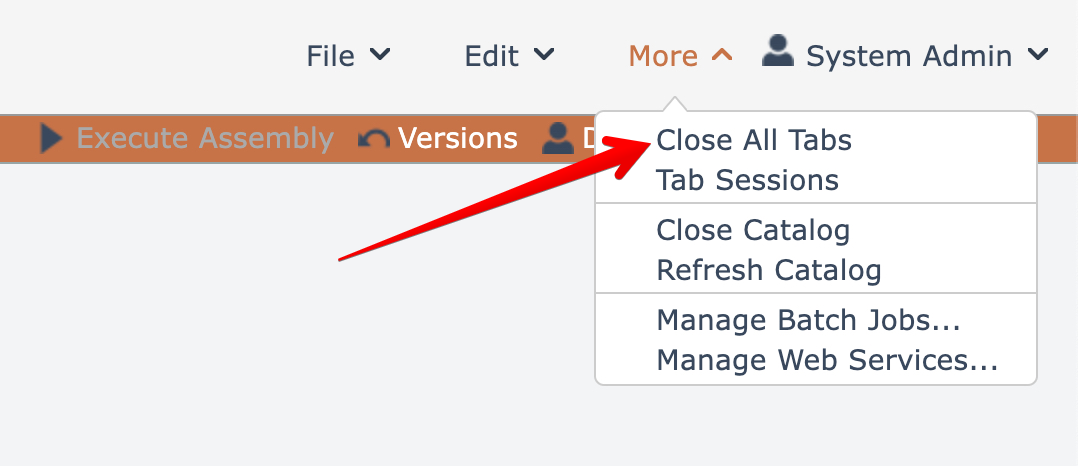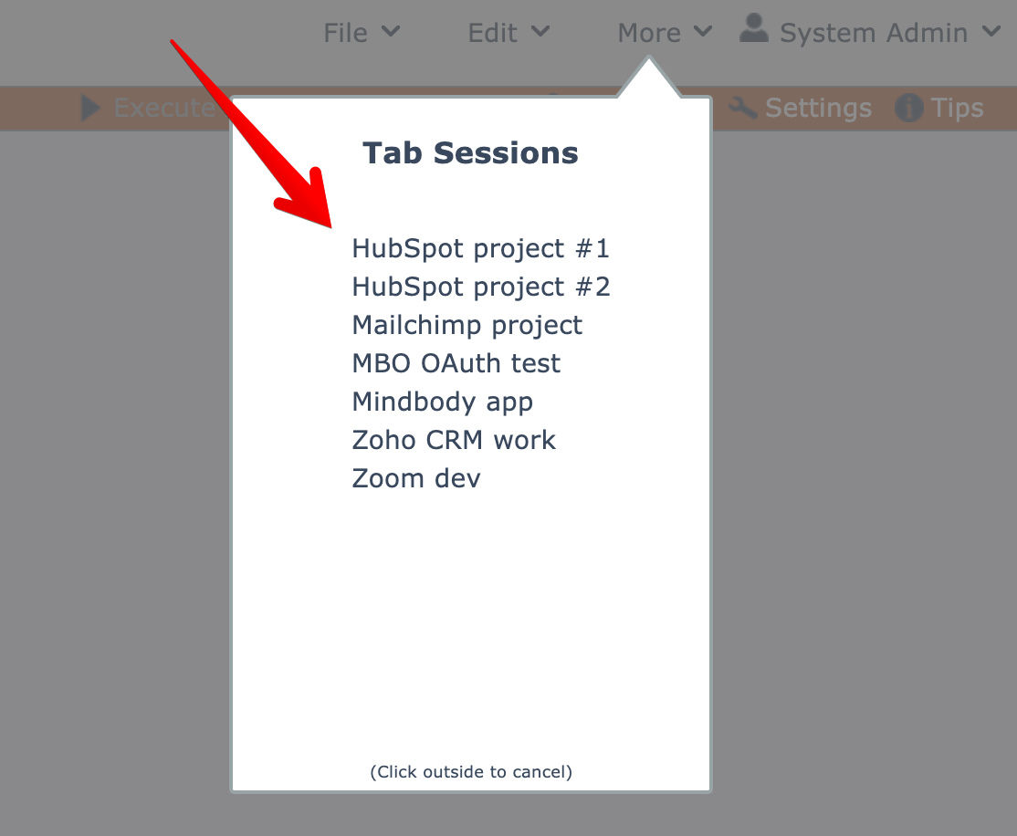 Normally you will want to close all opened tabs before opening a different tab session by choosing the Close All option under the More menu at the top right: