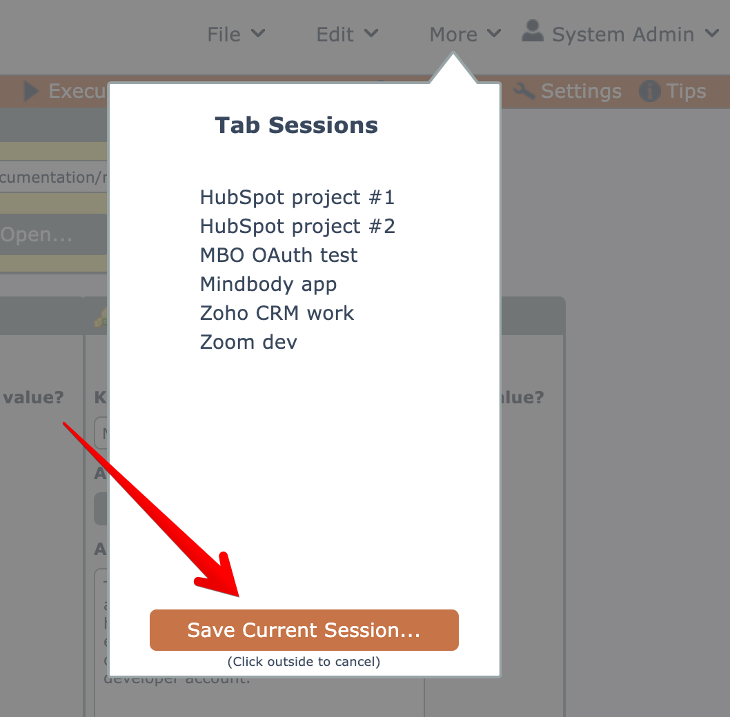 To save the currently opened group of tabs, choose the Tab Sessions option under the More menu at the top right: