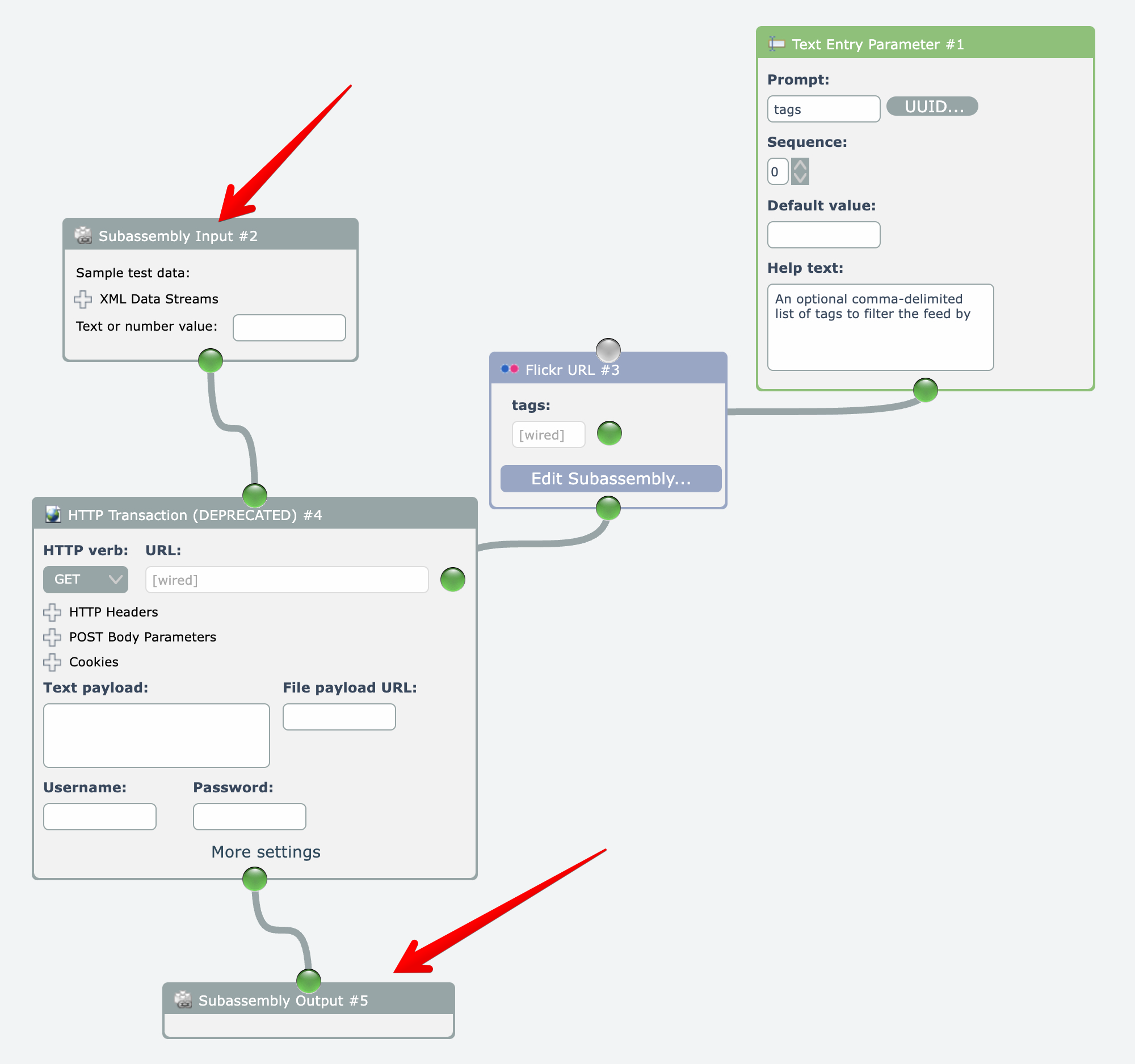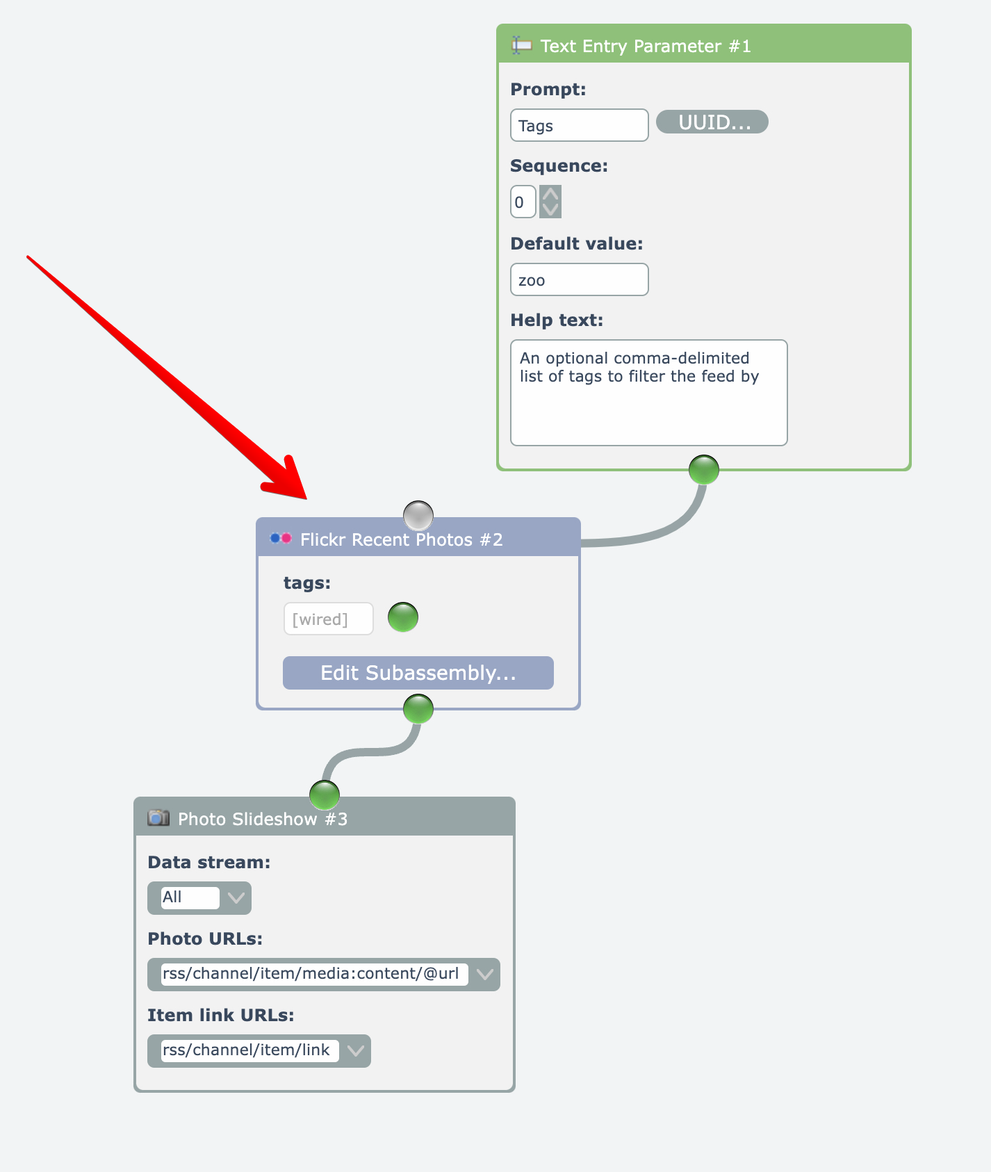 In the example below, the Flickr URL subassembly has a parameter "tags" defined: