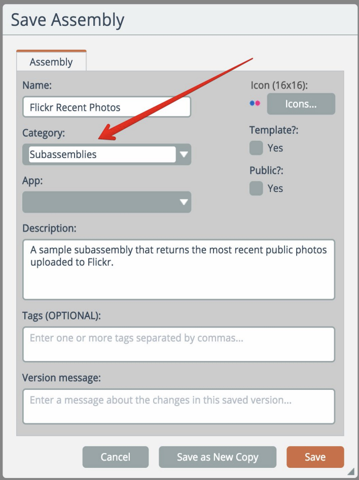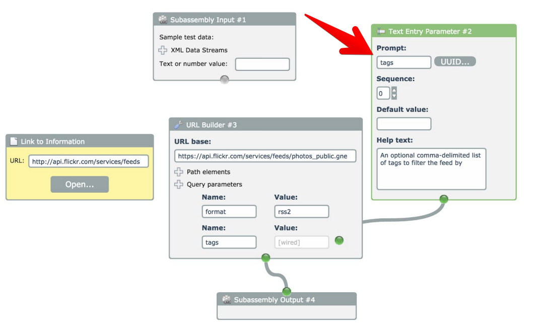 Now, the "tags" parameter can be configured without having to edit the Flickr URL subassembly.