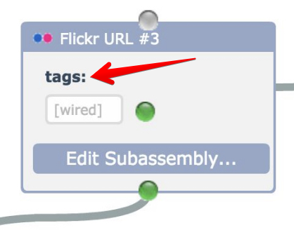 When the Flickr URL subassembly is used, the "tags" parameter becomes exposed in the subassembly window as a configurable field value: