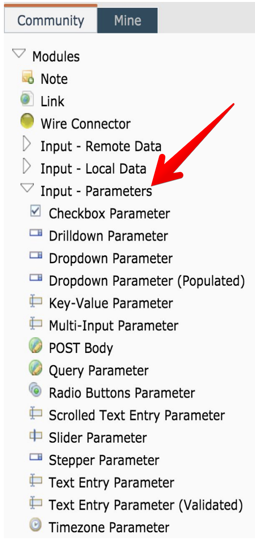 Various types of Parameter modules are available, including checkboxes, sliders, and more. Each parameter value will appear using the UI control specified by the type of Parameter module used.