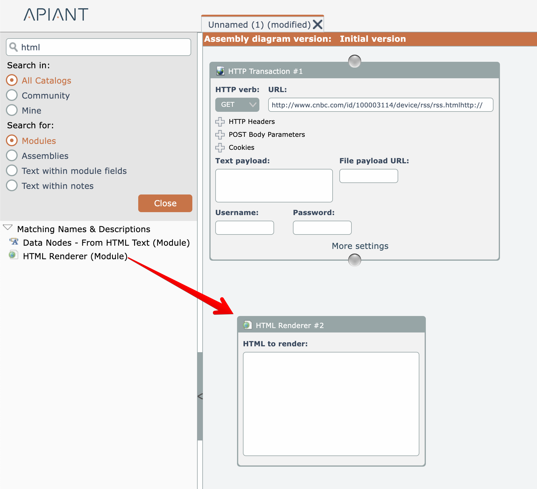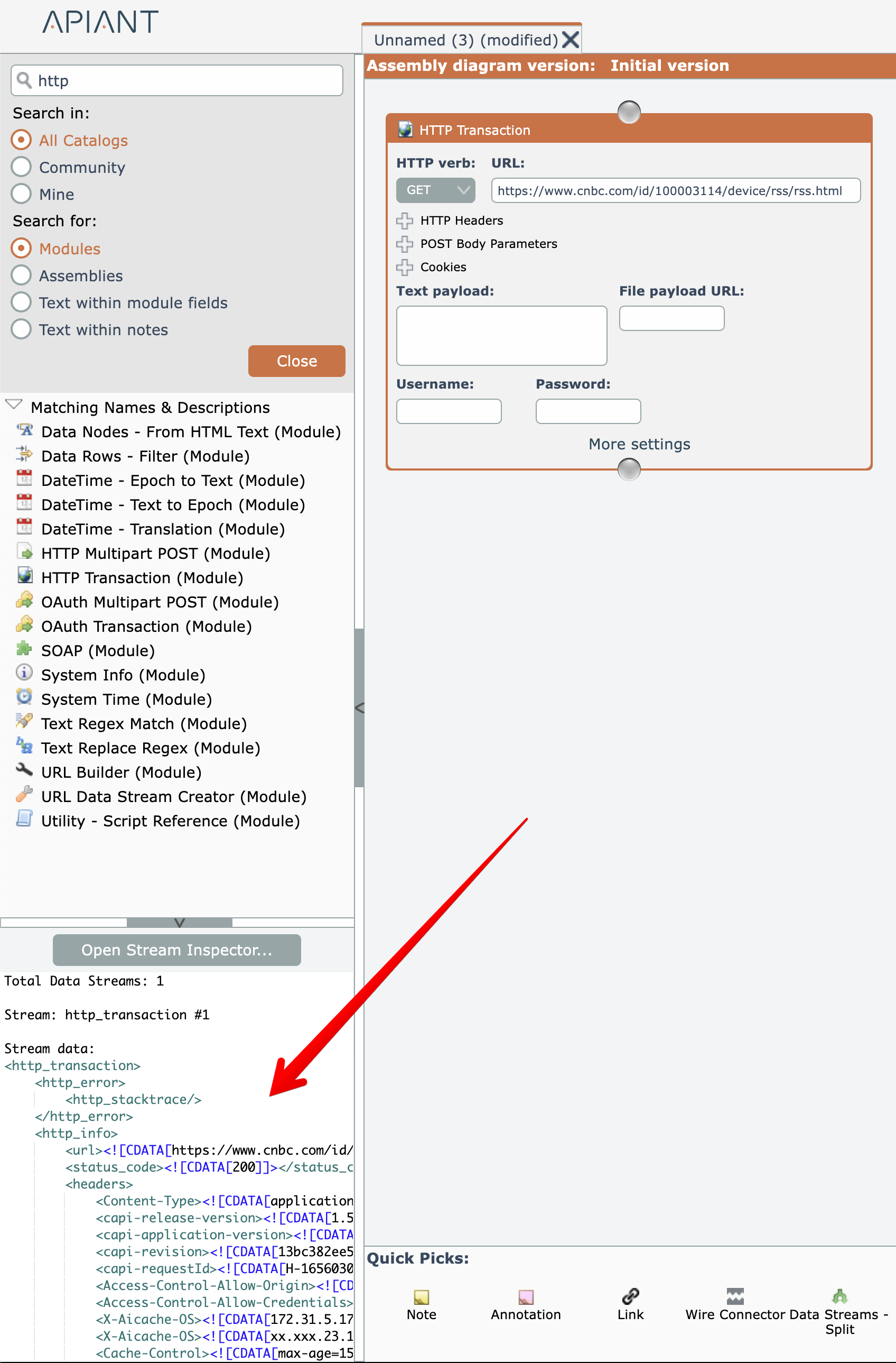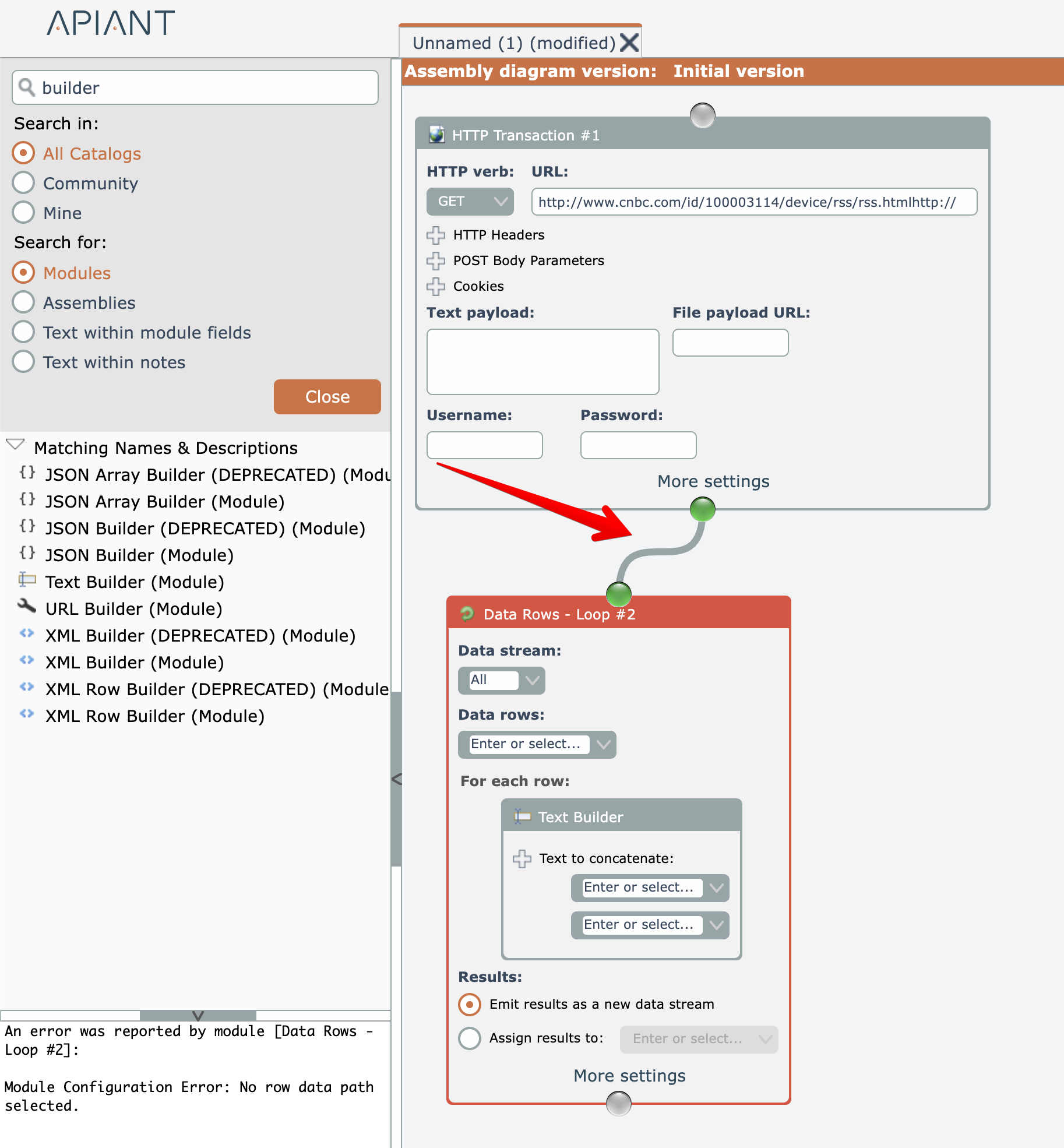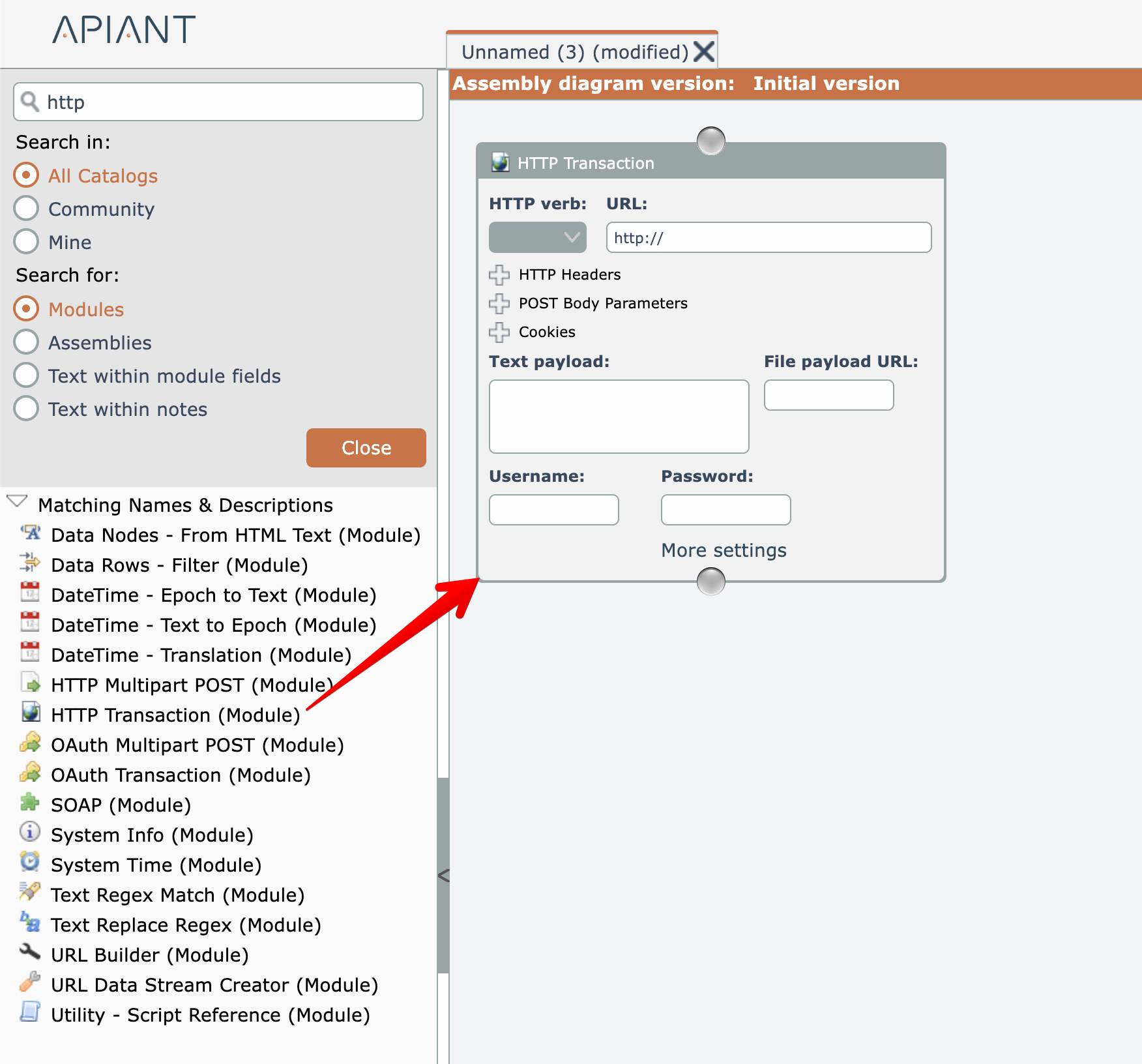 Lots of modules match the search. I'm experienced so I know that the HTTP Transaction module will let me fetch that news feed's data. Drag the module out of the catalog and place it near the top.