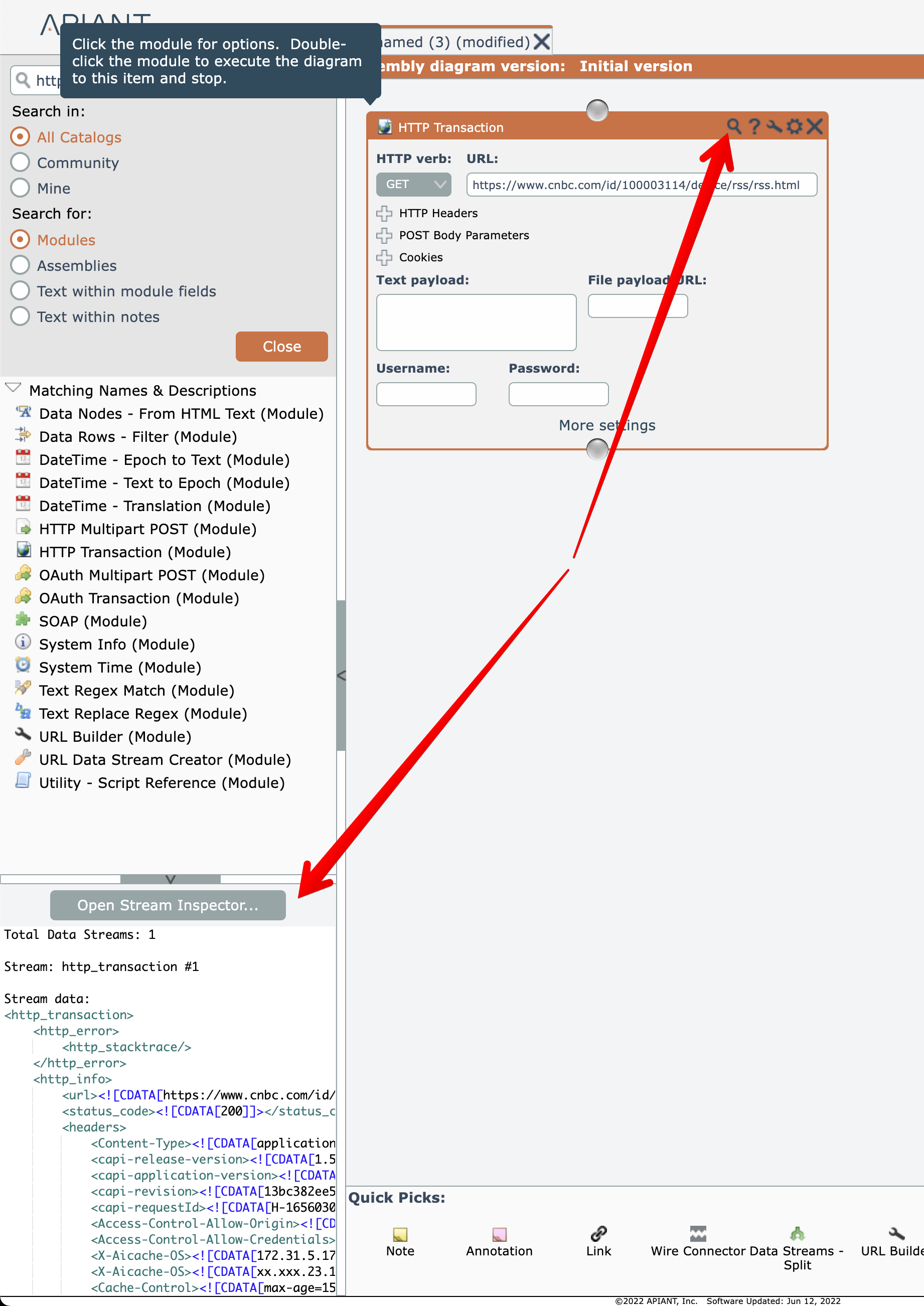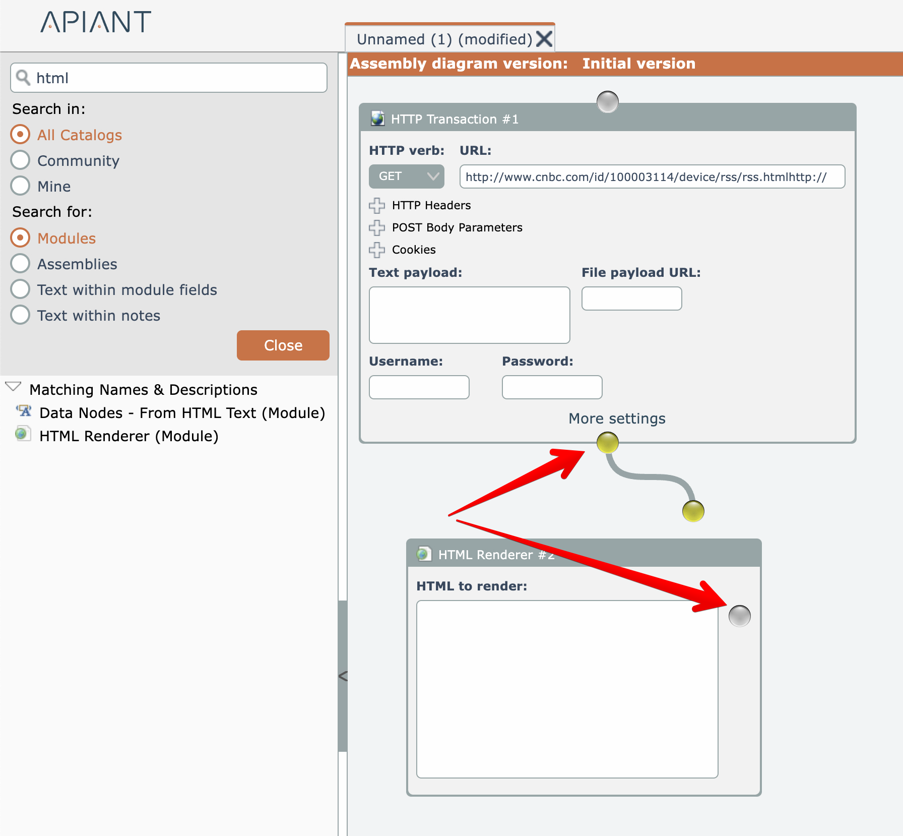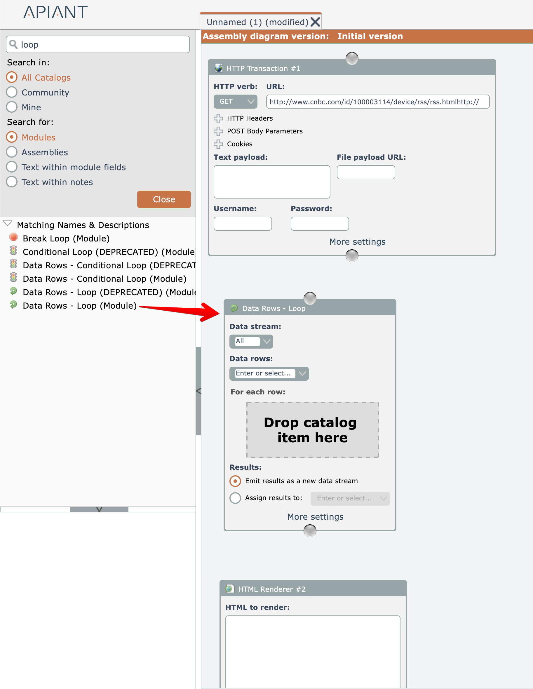 Lots of modules match the search. I'm experienced so I know that the HTTP Transaction module will let me fetch that news feed's data. Drag the module out of the catalog and place it near the top.