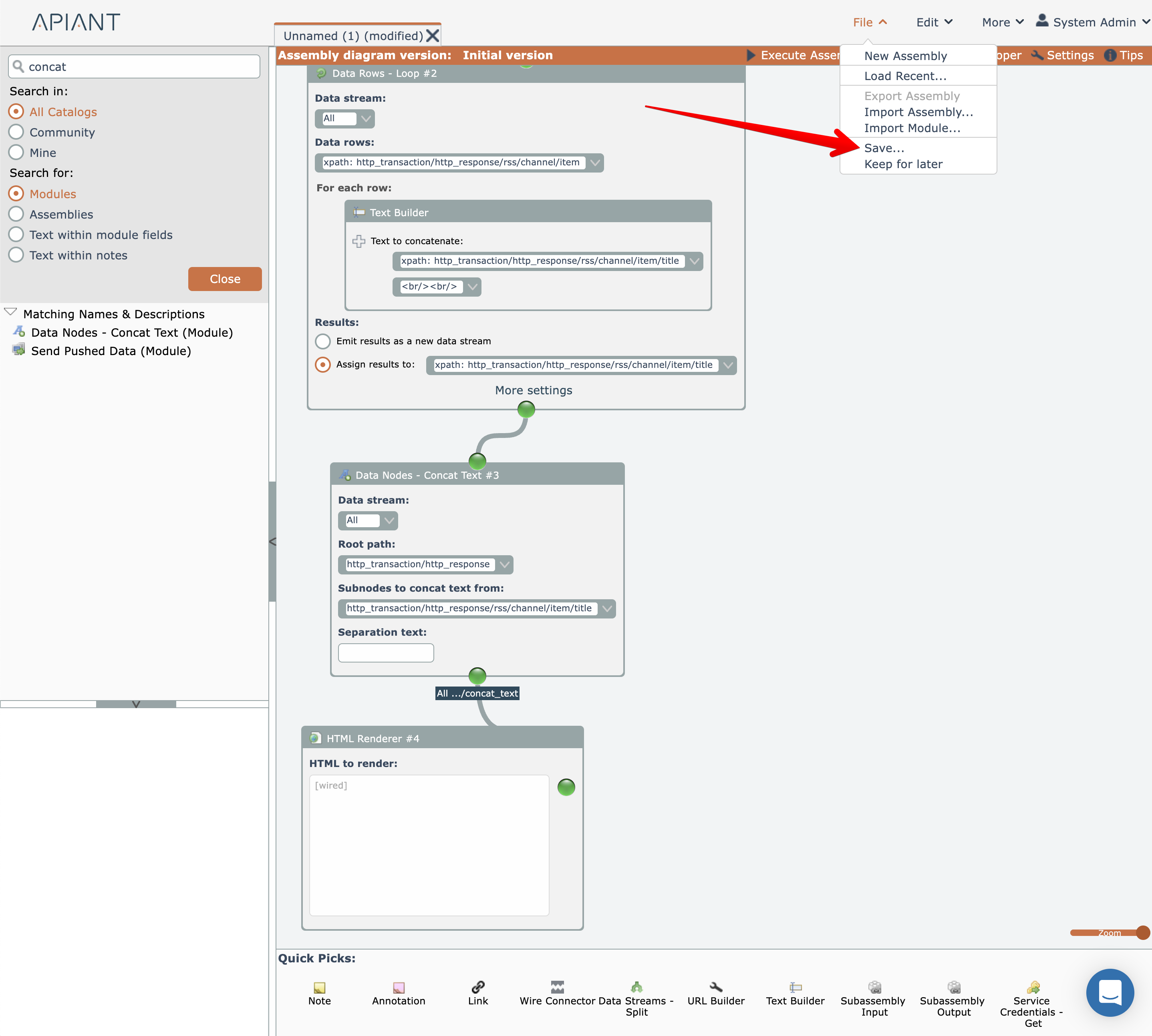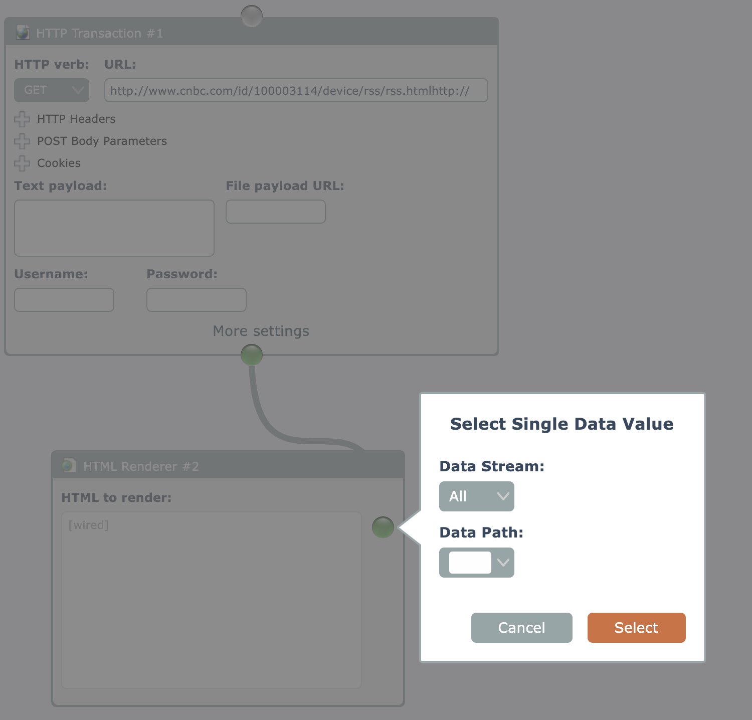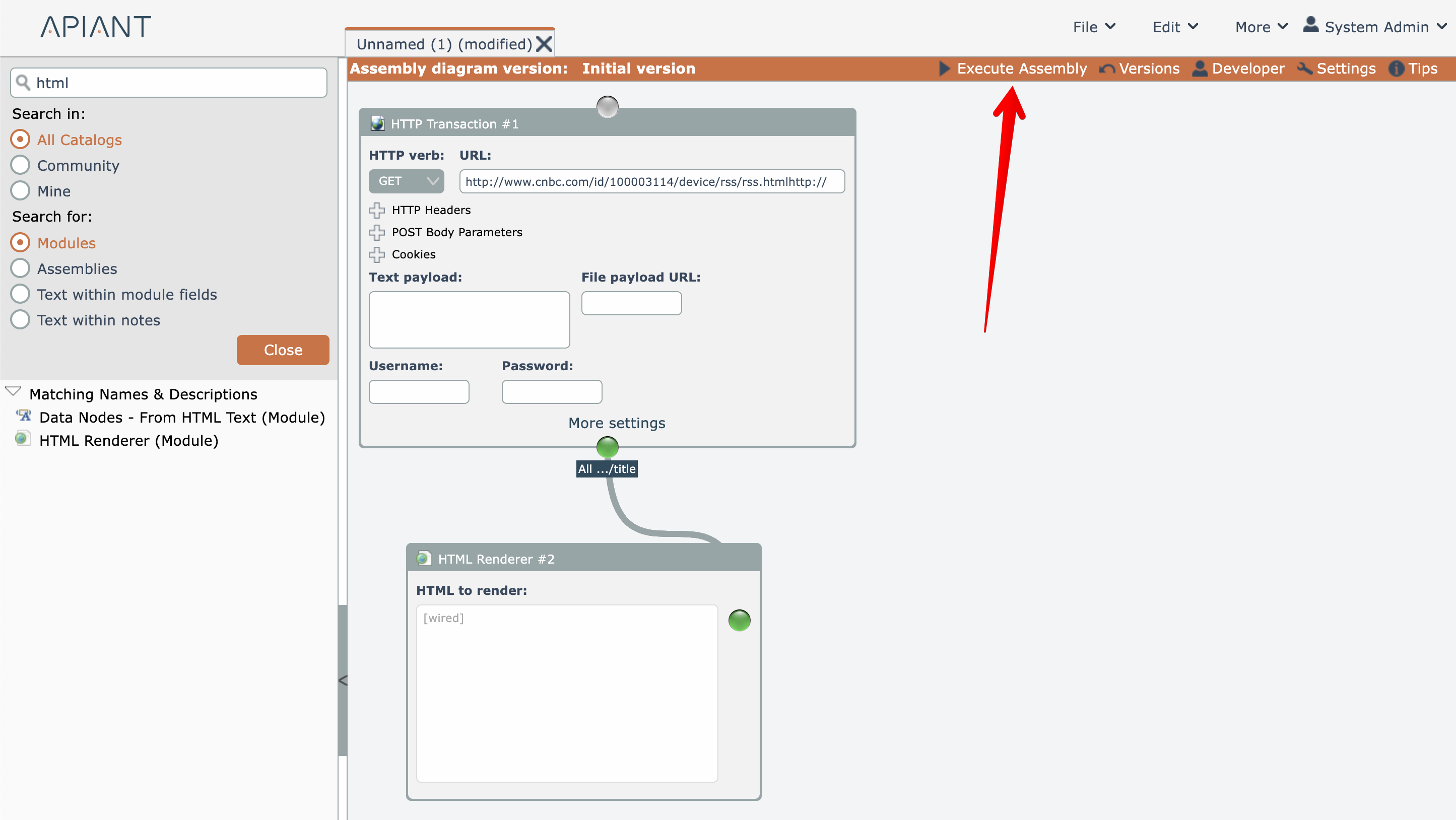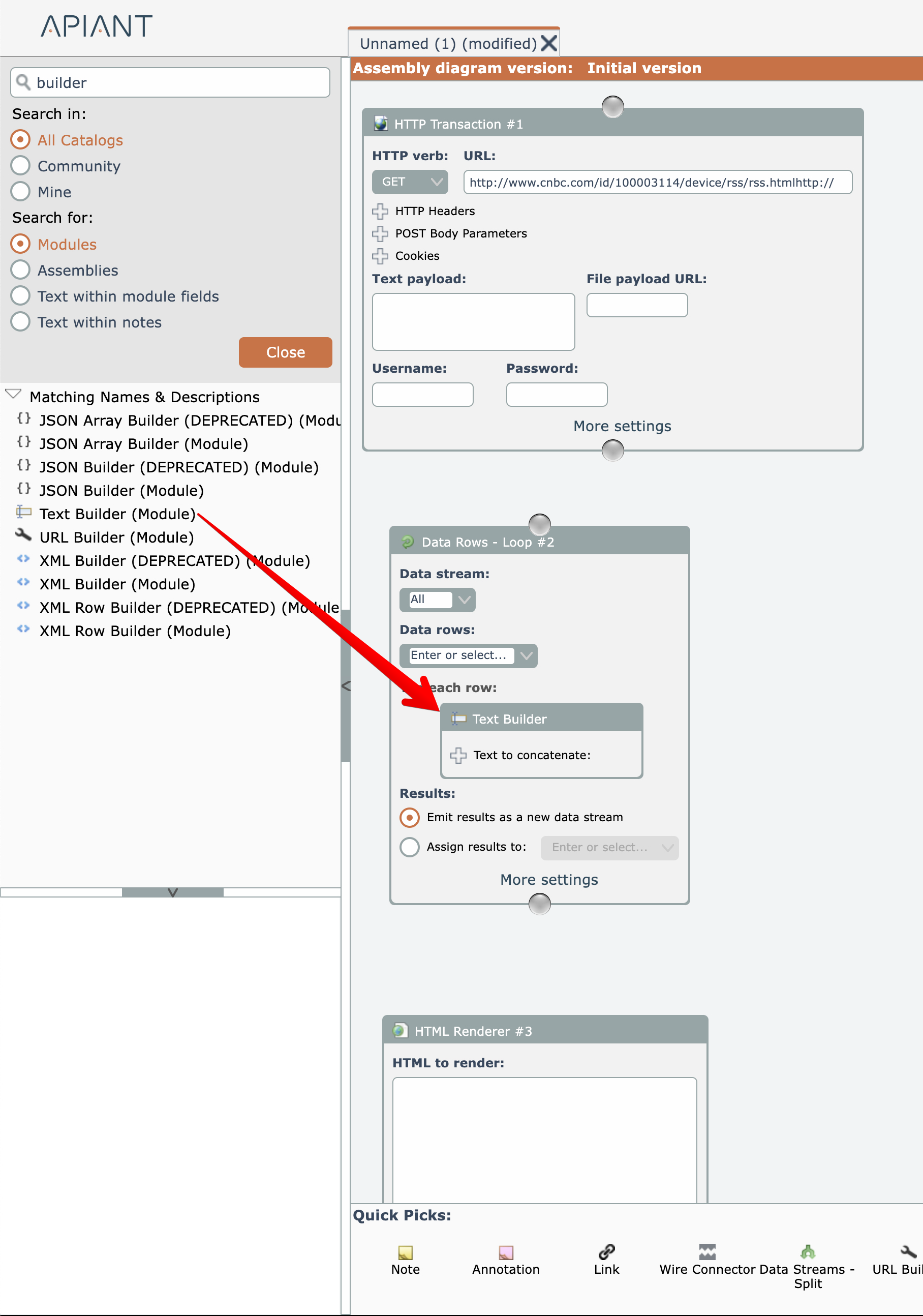 Lots of modules match the search. I'm experienced so I know that the HTTP Transaction module will let me fetch that news feed's data. Drag the module out of the catalog and place it near the top.