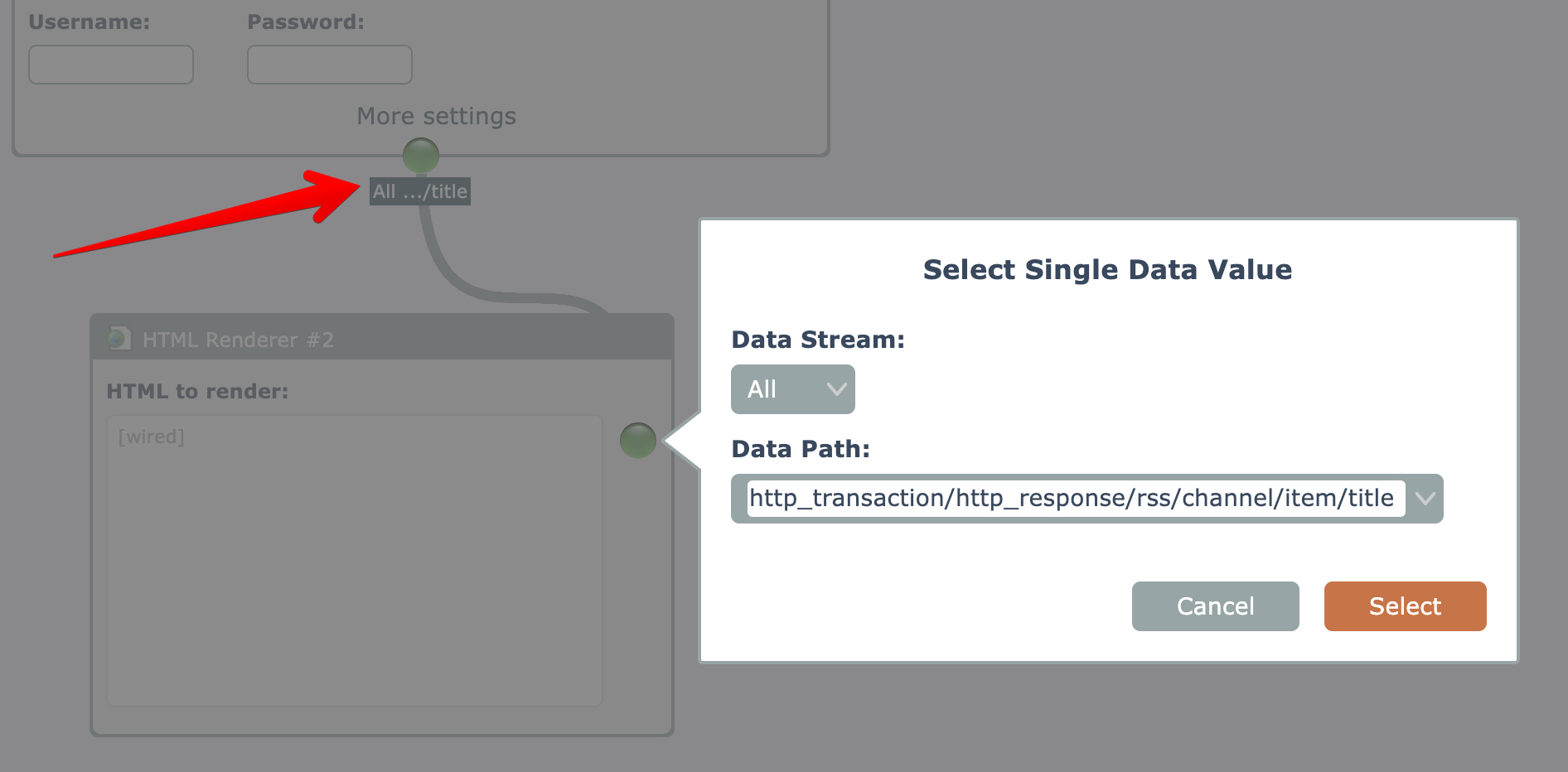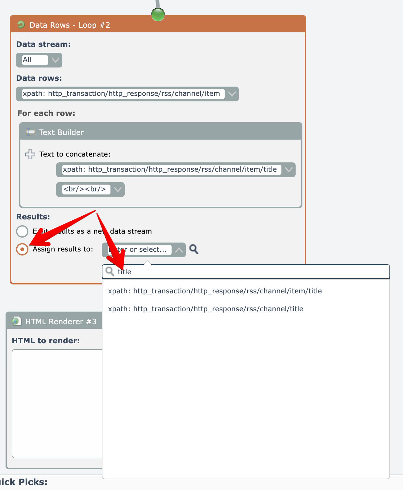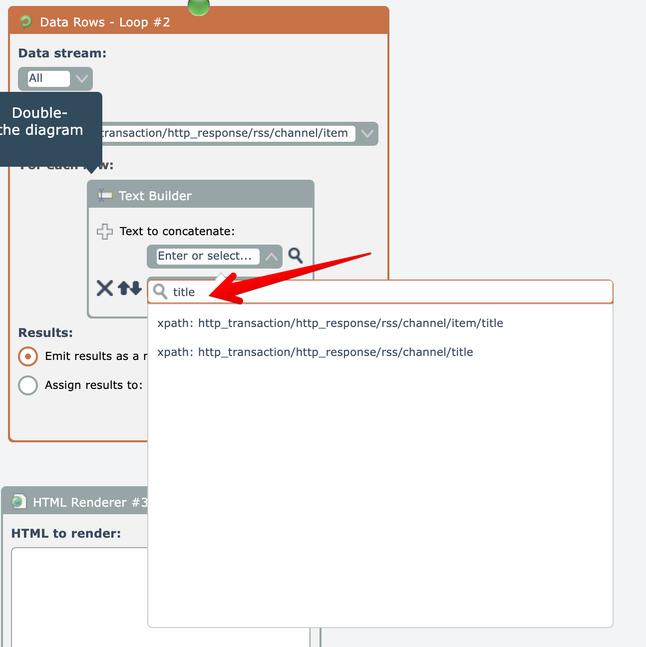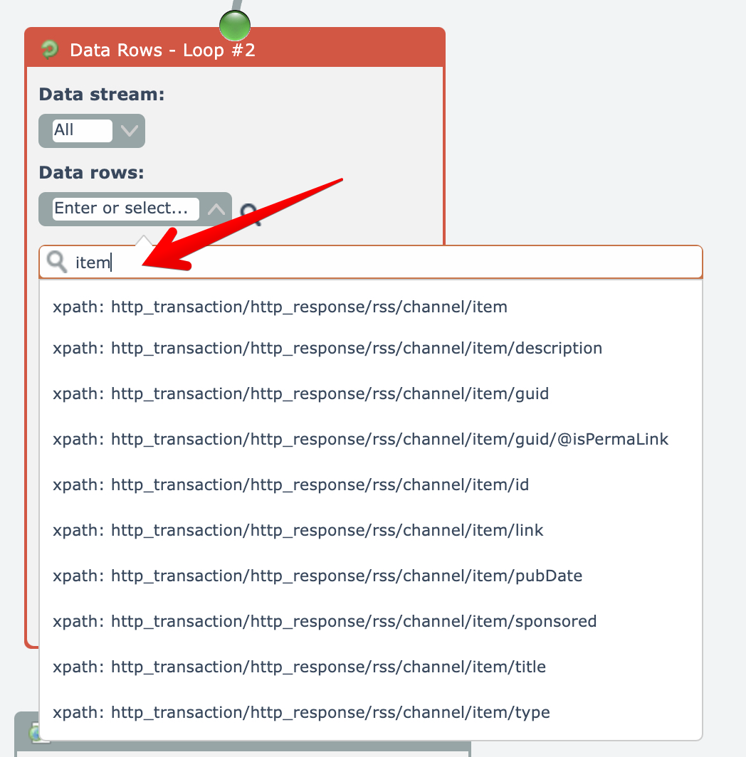It needs to know which data rows will be looped upon. We want to process each article's title. Each article is an "item" node in the feed, so we search for "item" and select the first entry: