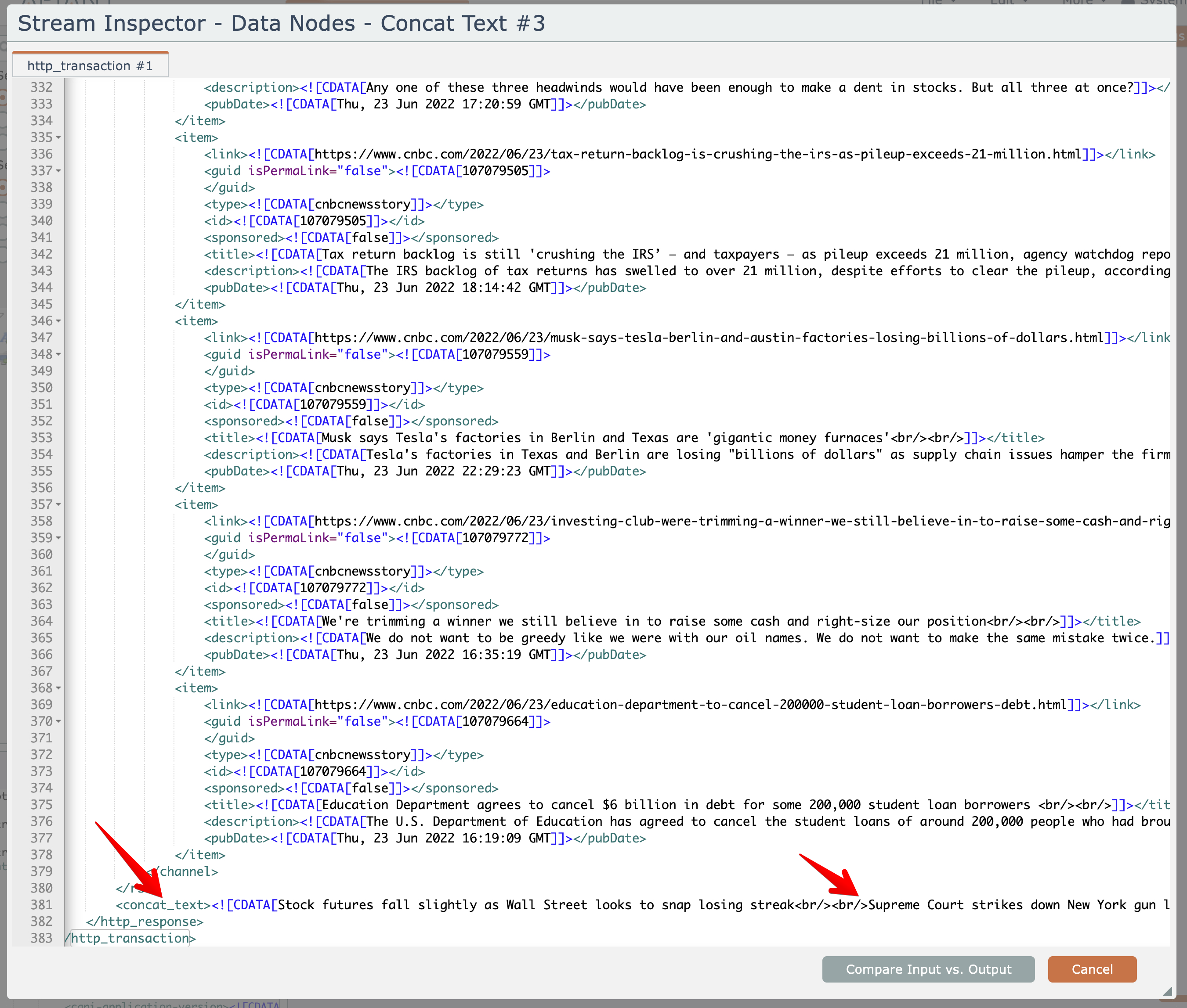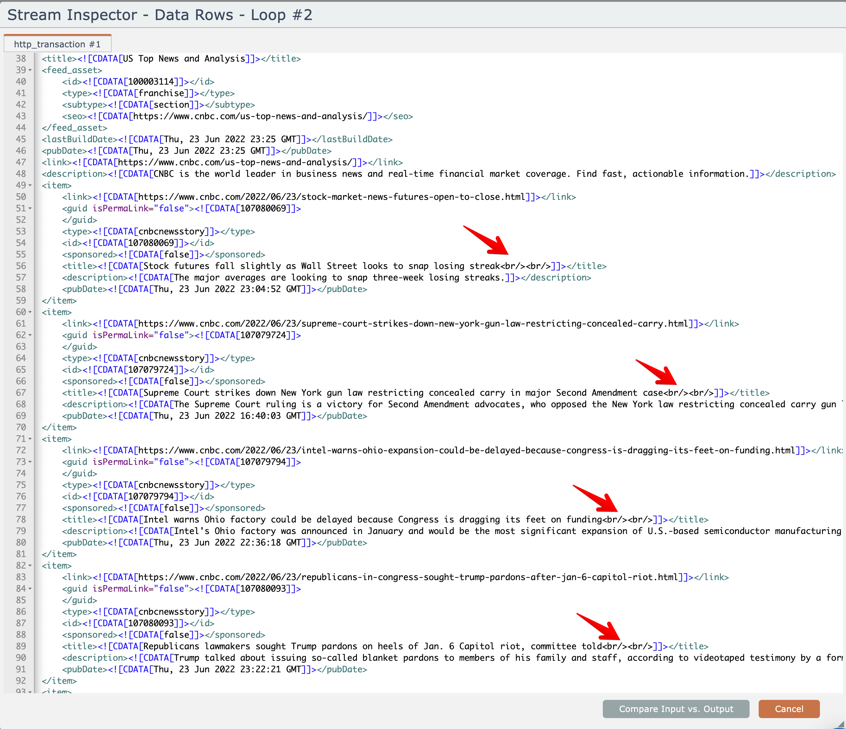 Now let's check our work. Double-click on the Loop to run the assembly and open the Loop module's Stream Inspector. The HTML newlines should now be there: