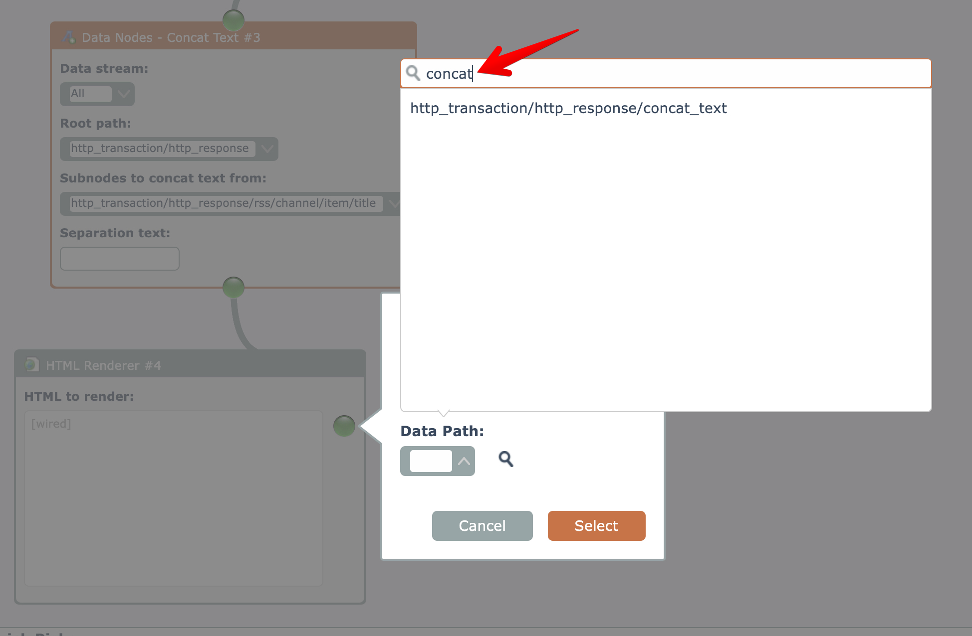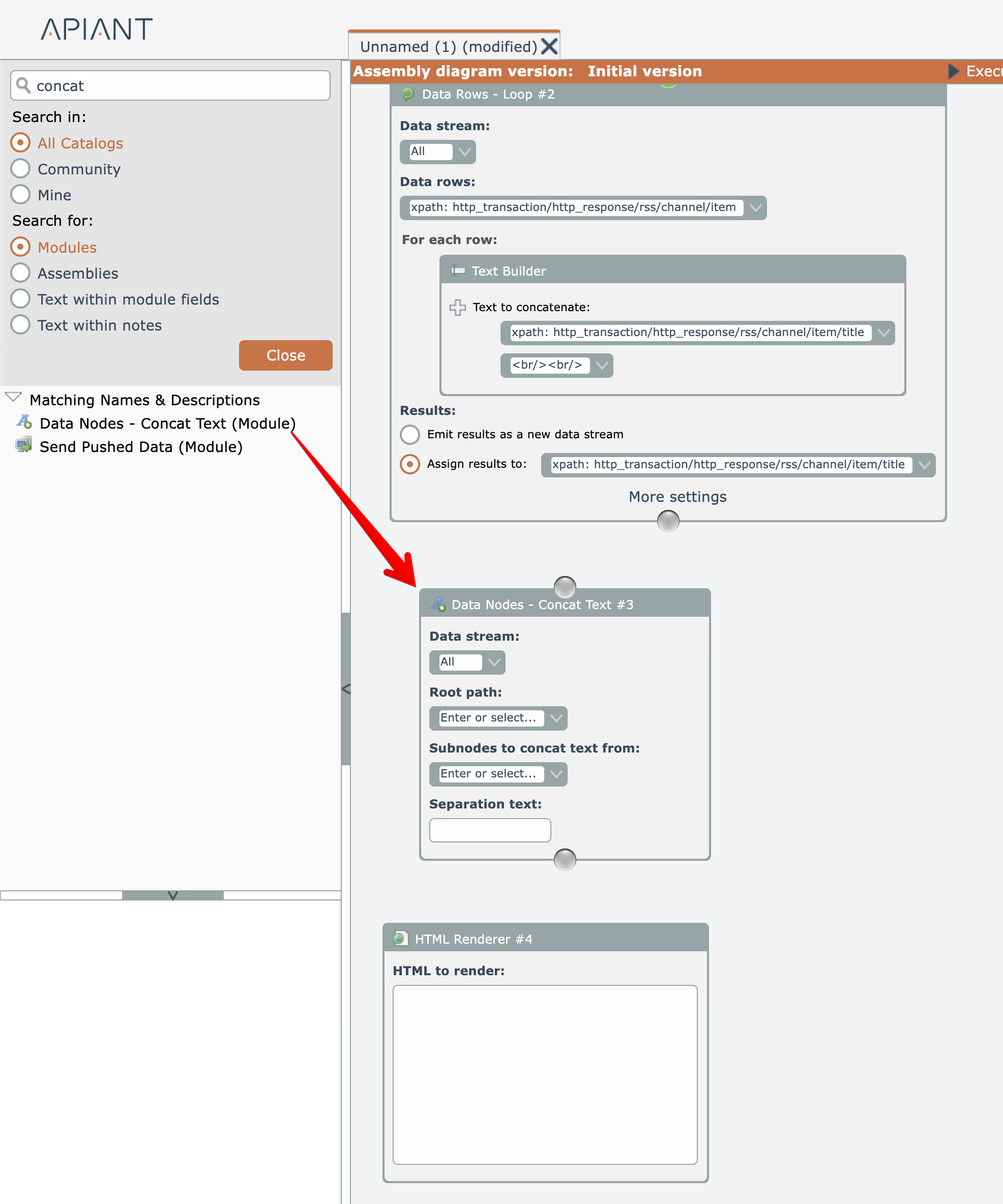 Unwire modules #2 and #3, move module #3 down lower to make space, search for a "concat" module in the catalog, then drag the Data Nodes - Concat Text module here: