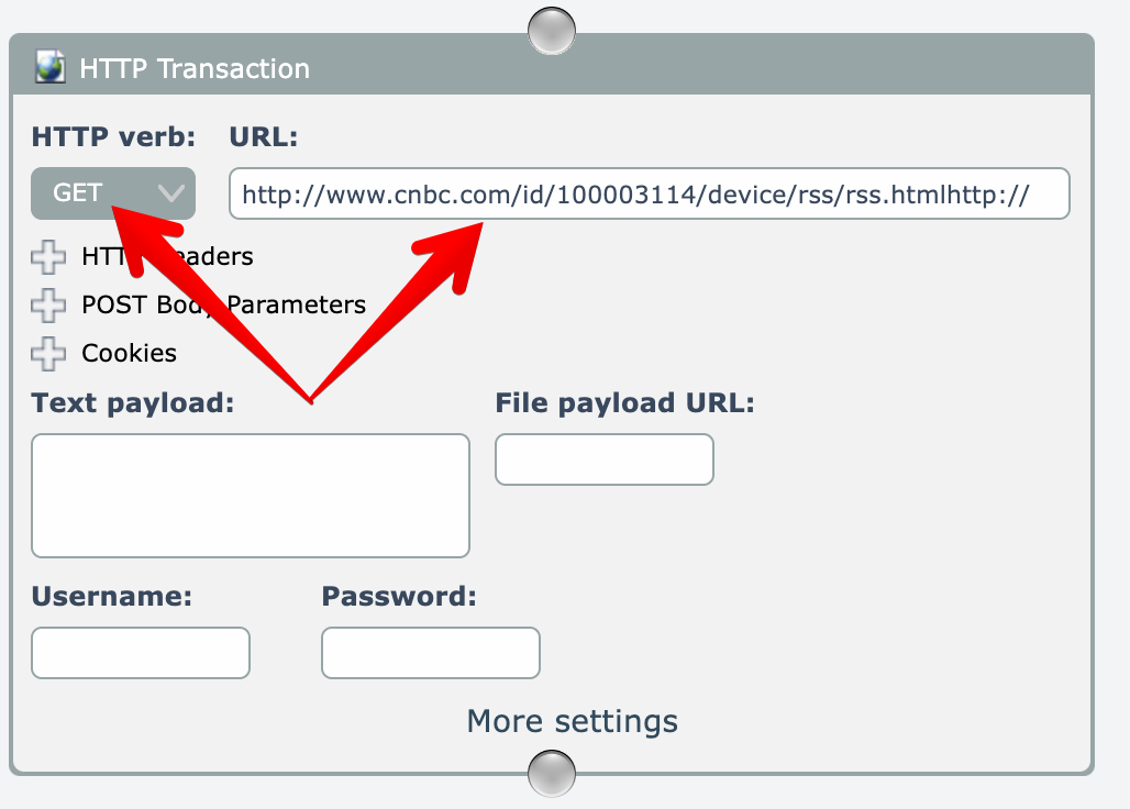 We choose "GET" as the verb and paste in the CNBC feed URL: