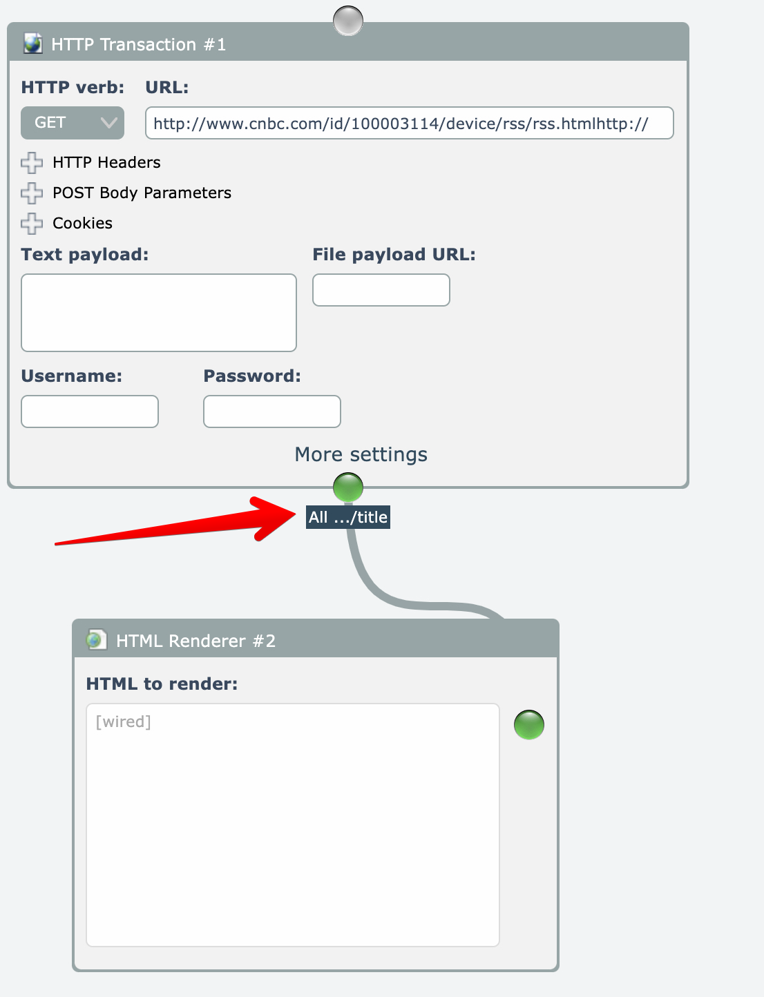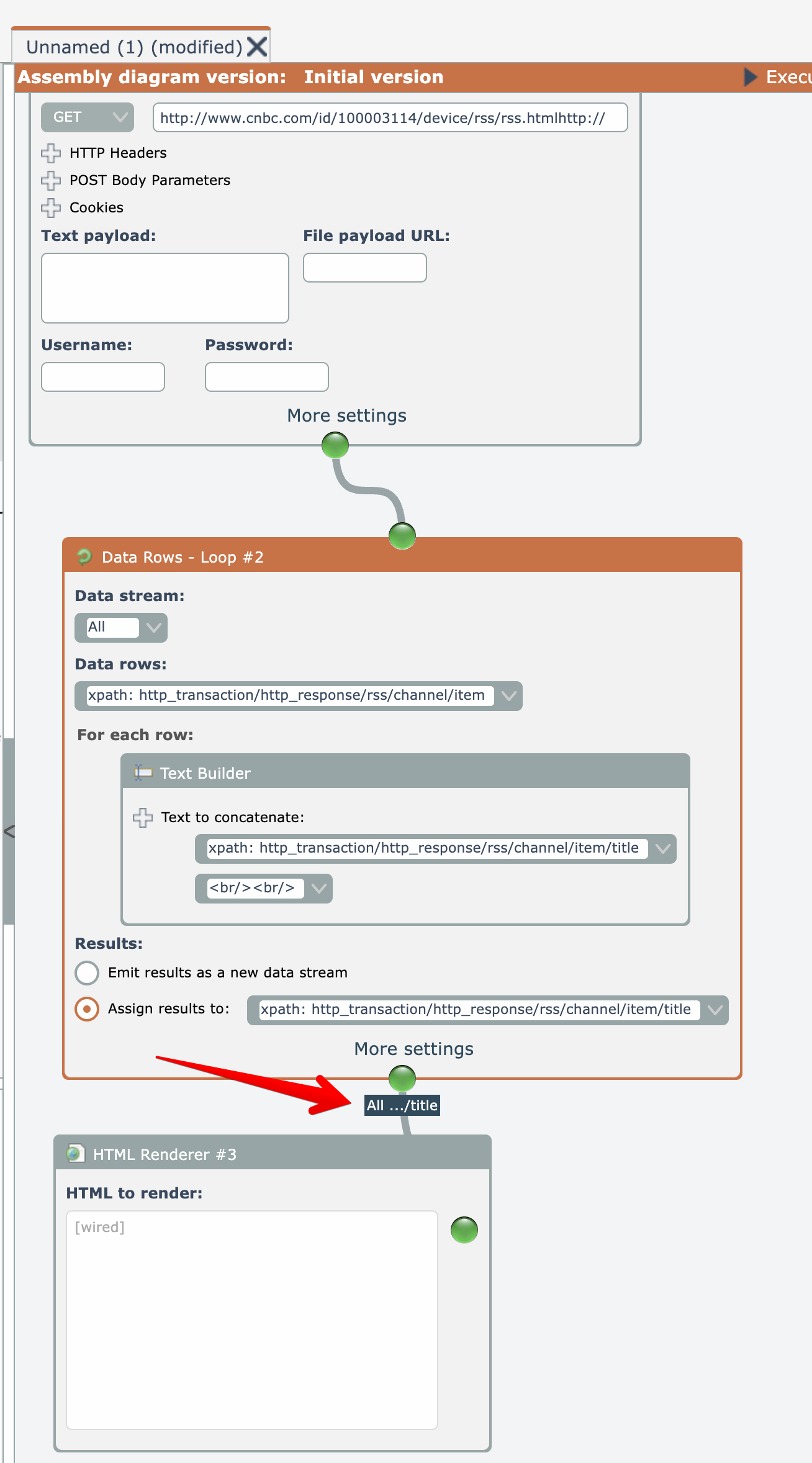 This first assembly will show how to build a little visual widget that will display the latest article titles from the CNBC news feed.