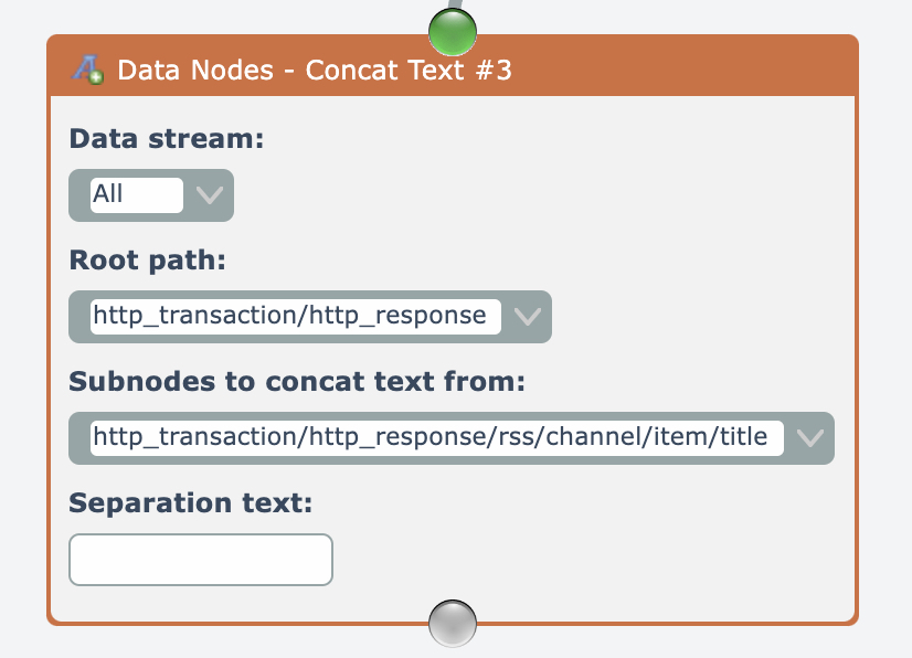 Wire the output from the Loop #2 into the Concat module #3, double-click module #3 to load it with data, then configure it like so: