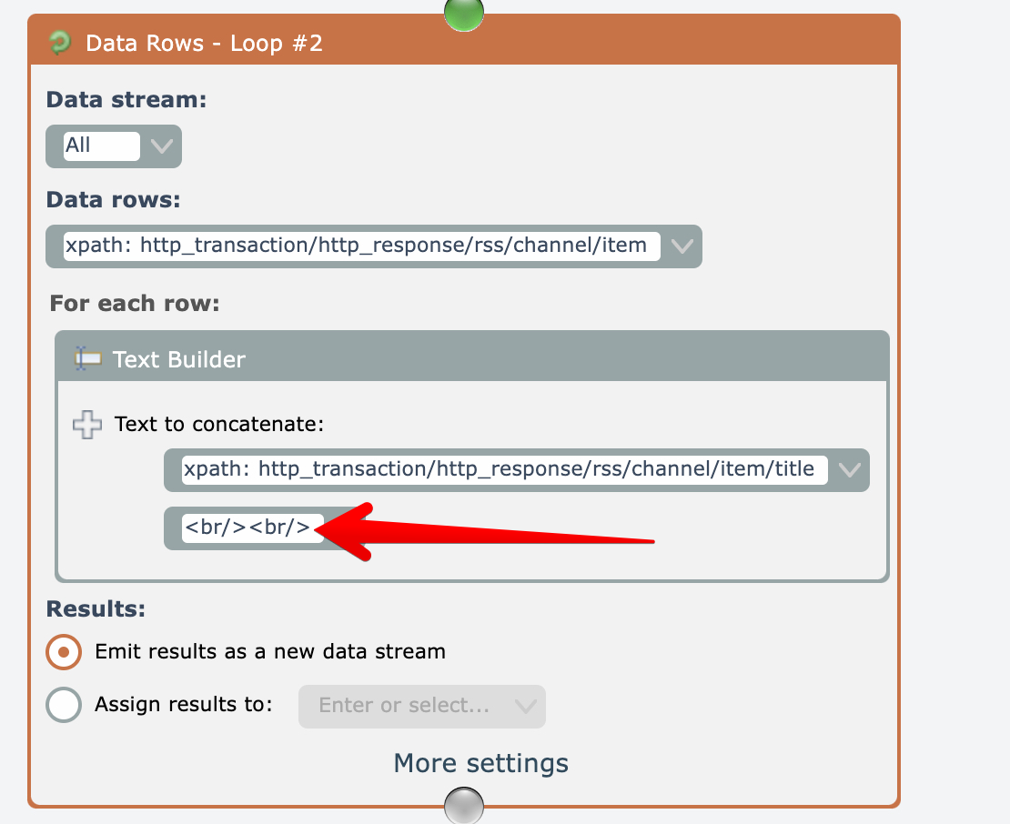 Now we need to configure the Loop so it will overwrite the previous title text with the output from the Text Builder with the appended newlines.