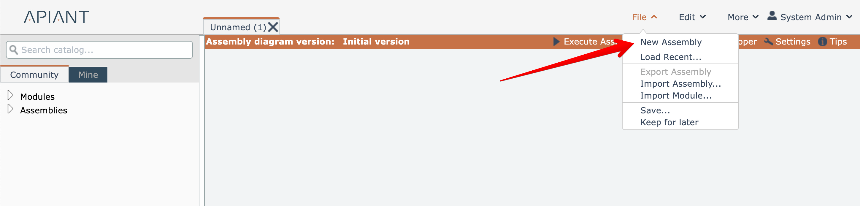 Start with a new assembly. By default the editor loads with an empty assembly called "Unnamed (1)".