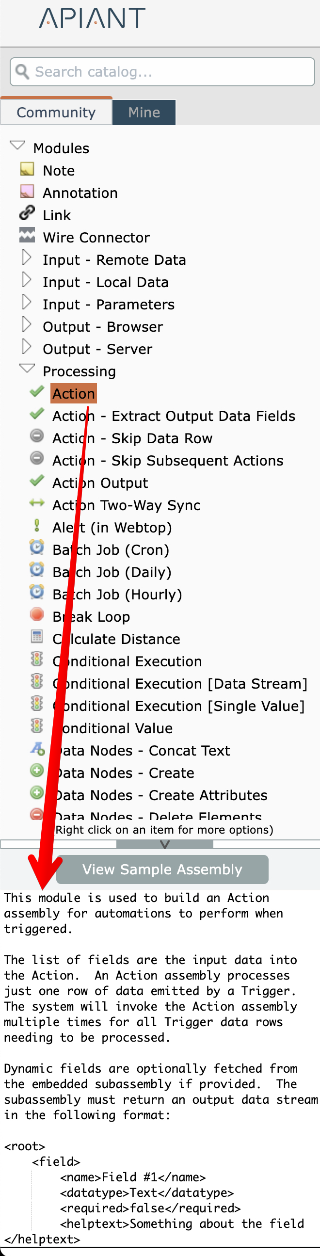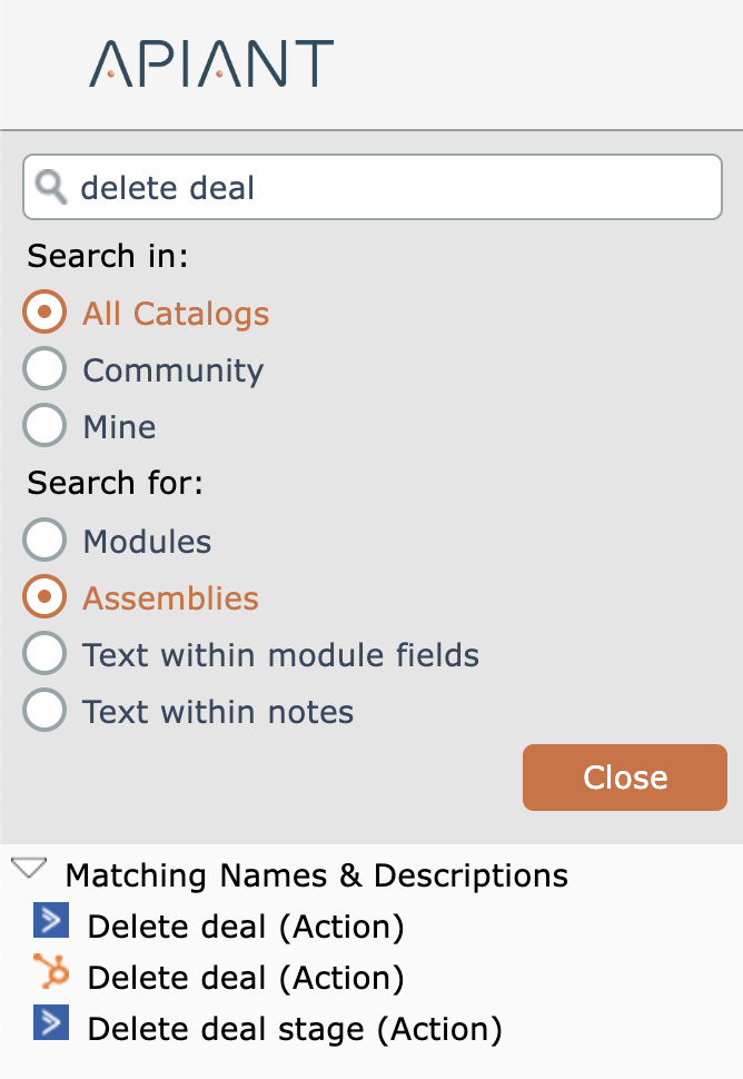 The "community" and "mine" catalogs can be searched together or separately for modules, assemblies, assemblies containing text within module fields, and assemblies having notes containing text.