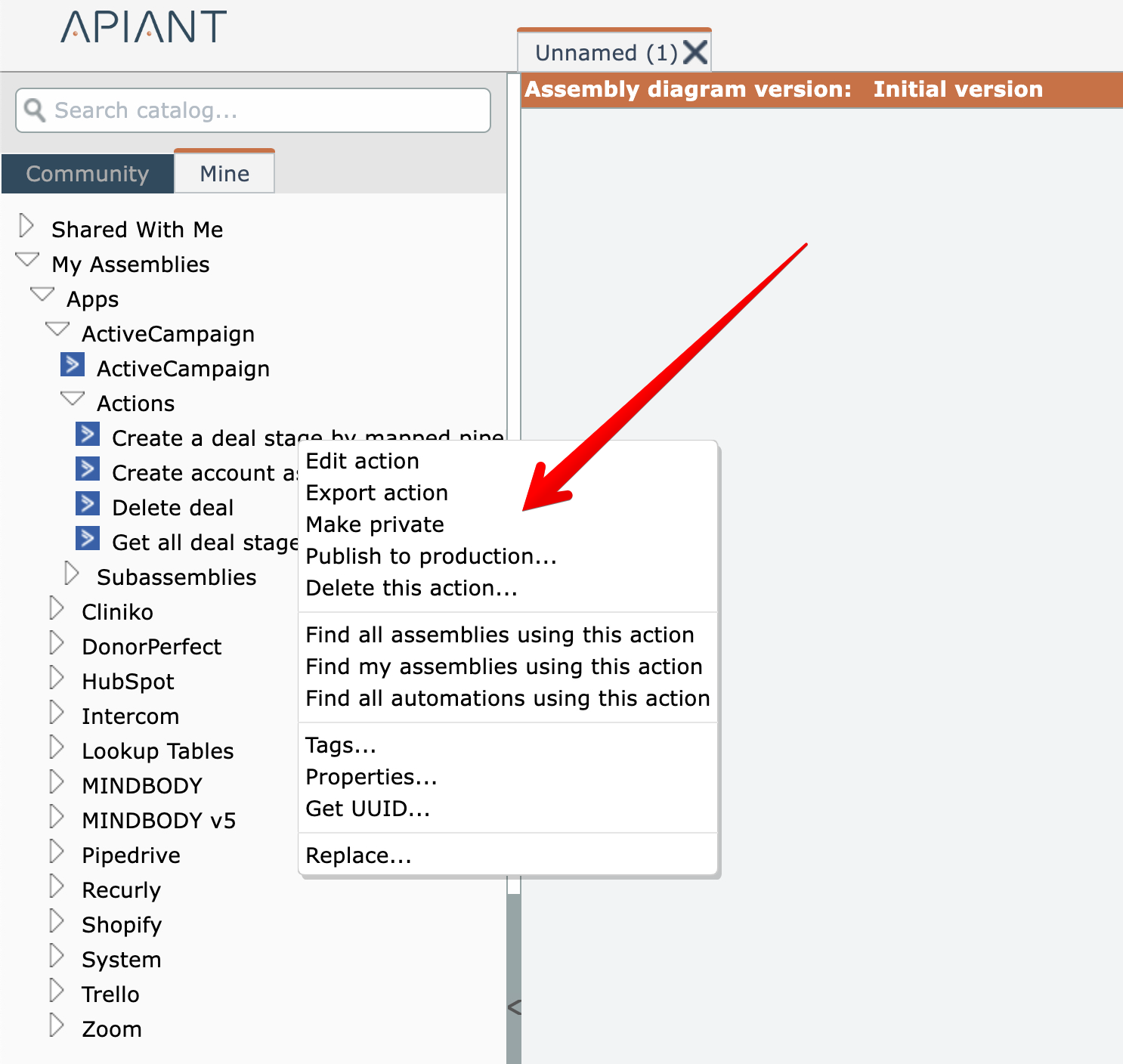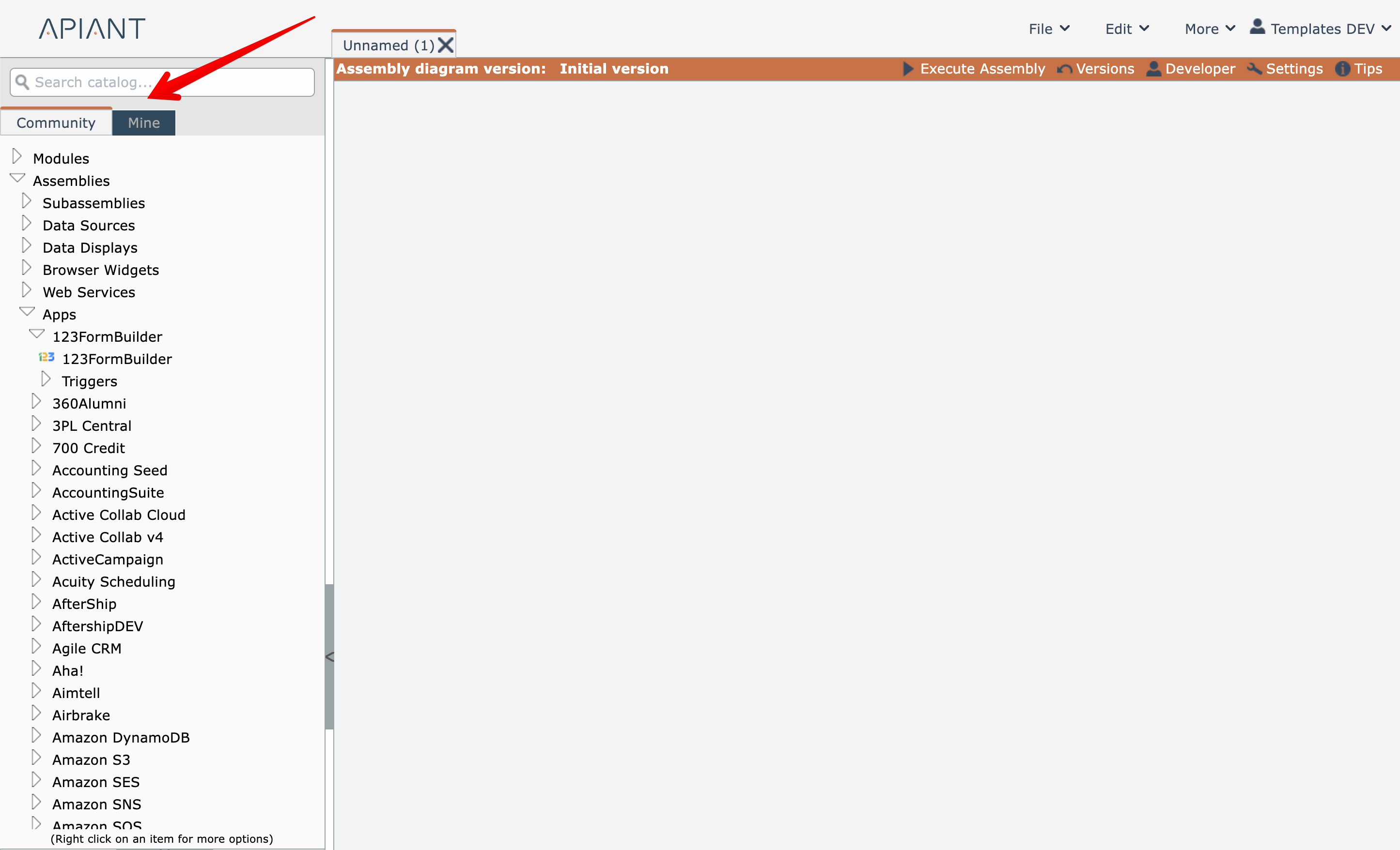The assembly editor's catalog on the left side contains modules, assemblies, and subassemblies that are public, yours, and shared with you: