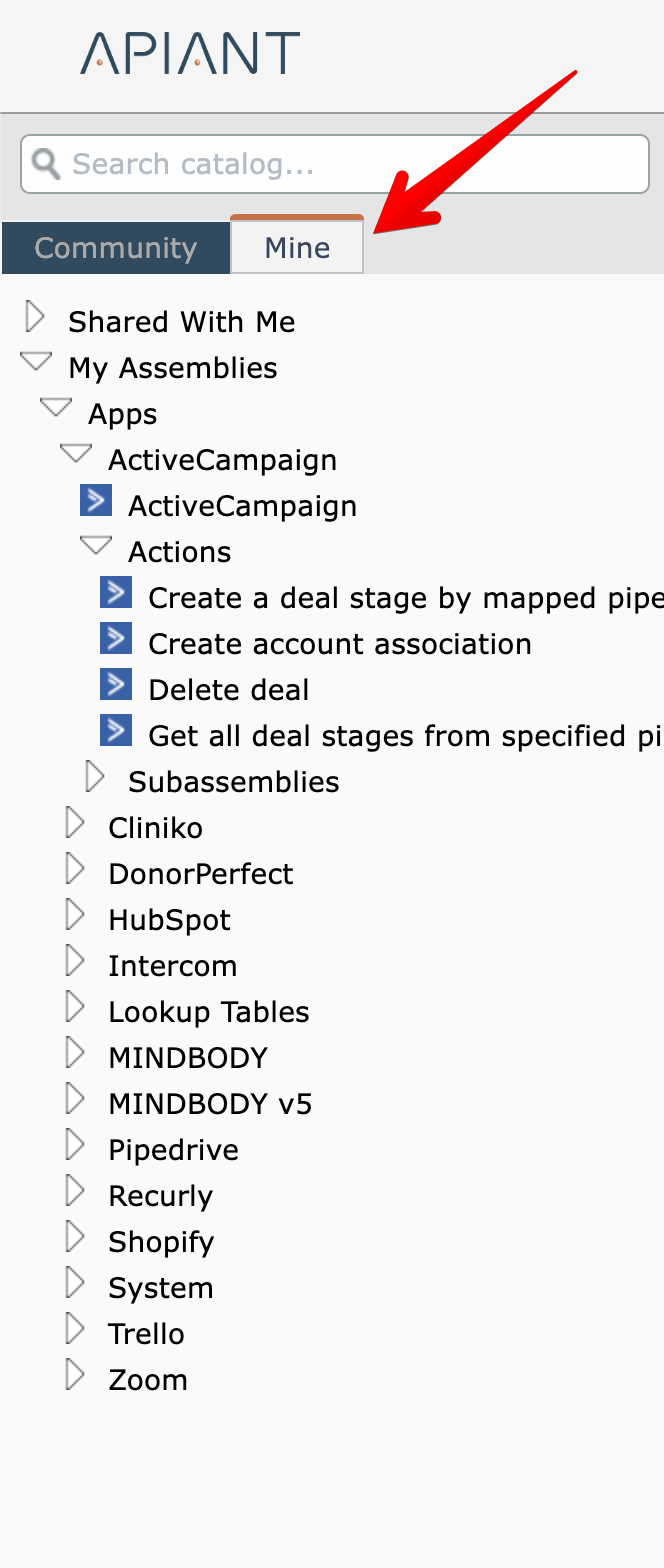 The "Mine" tab of the catalog contains content you created and private content created by other accounts that is shared with you: