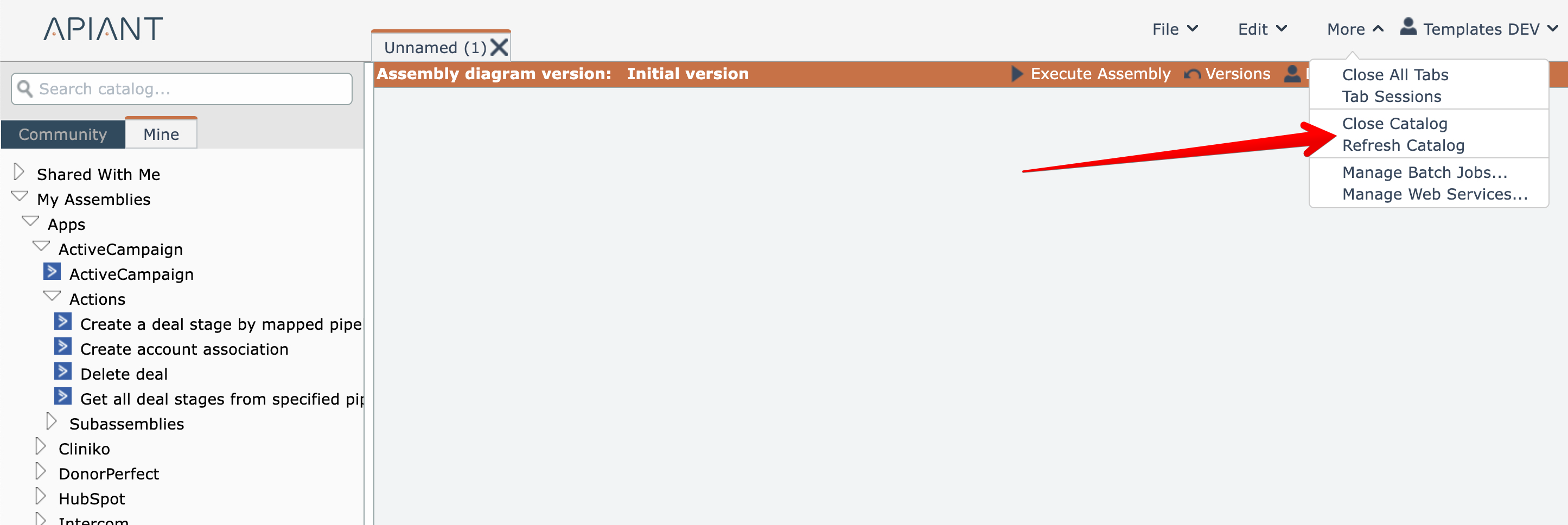 The catalog can also be opened/closed and refreshed via the menu options under the More menu at the top right: