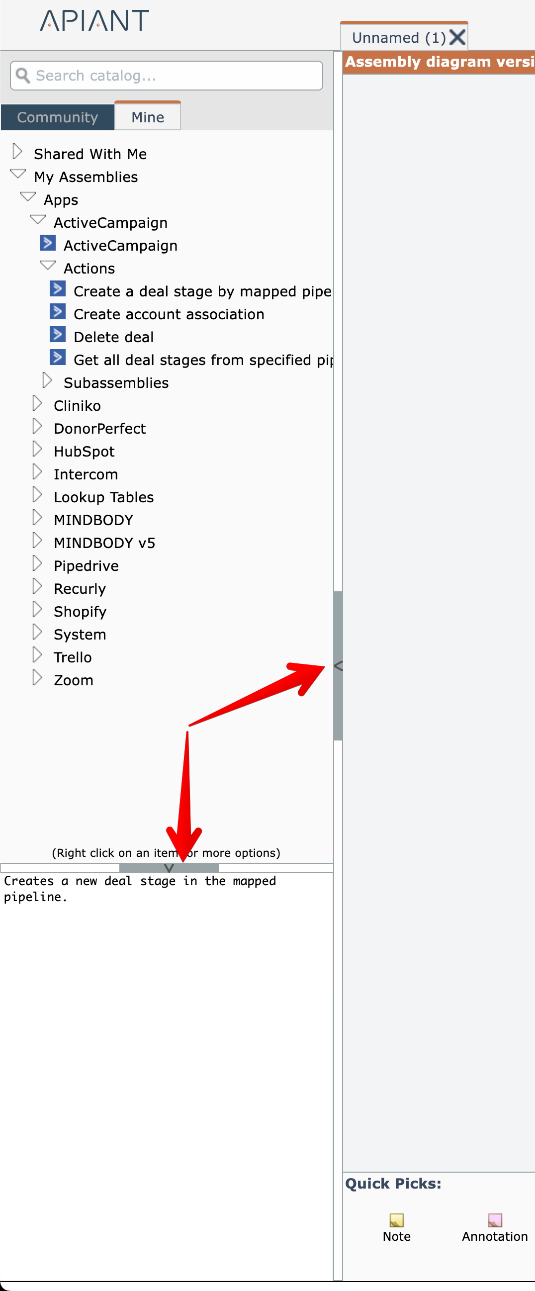 The catalog can be resized and open/closed by clicking or dragging the splitters: