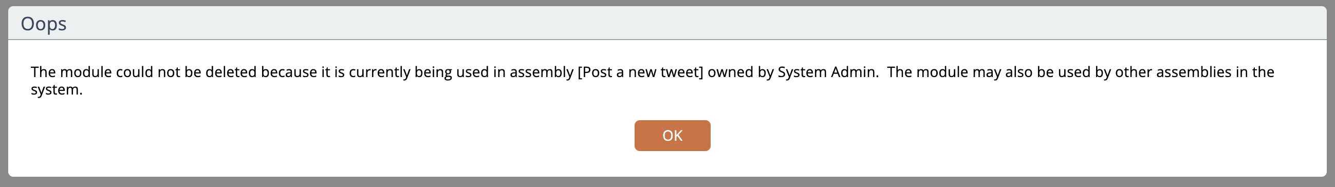 If the item is referenced, an error message will appear: