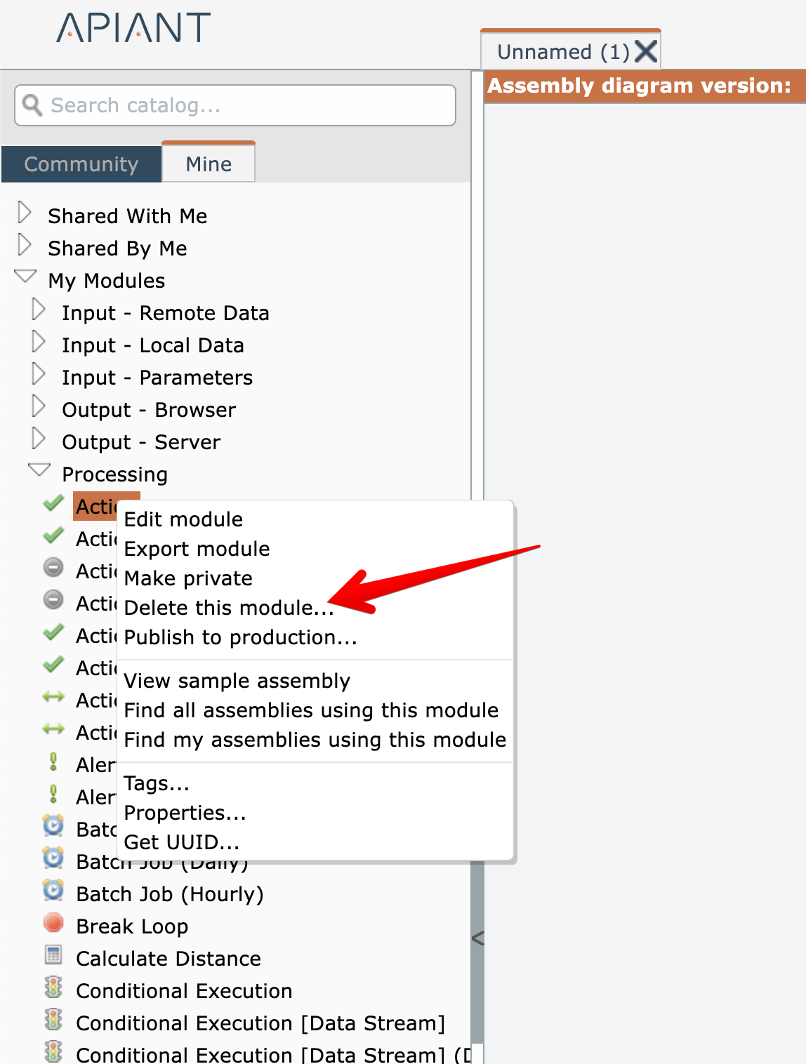 Unreferenced content you own can be deleted from the catalog by right-clicking on it and choosing the Delete option: