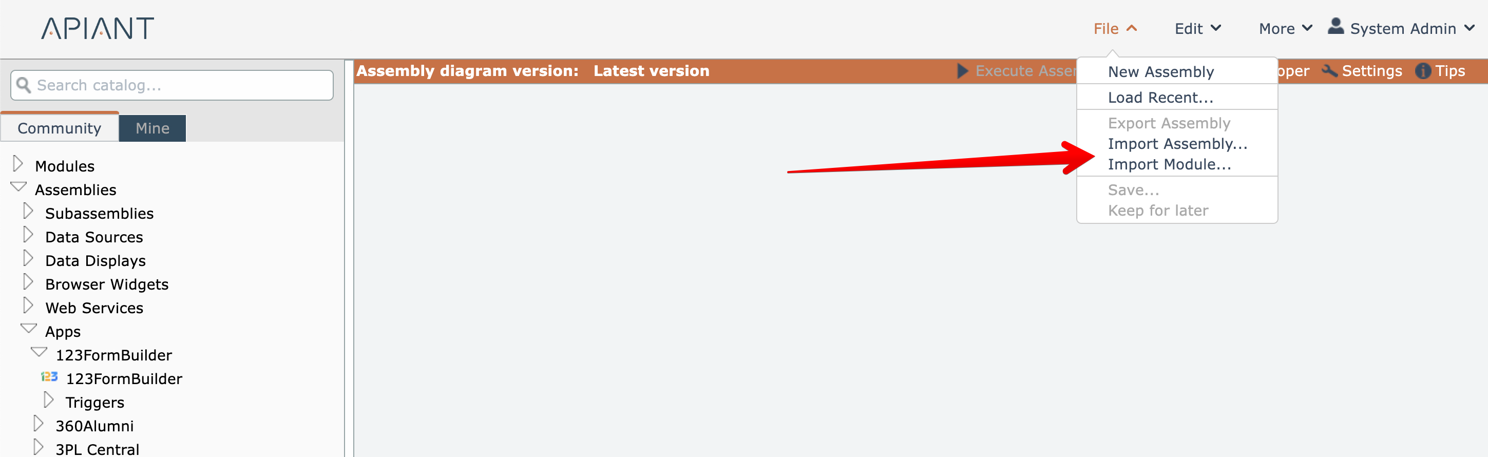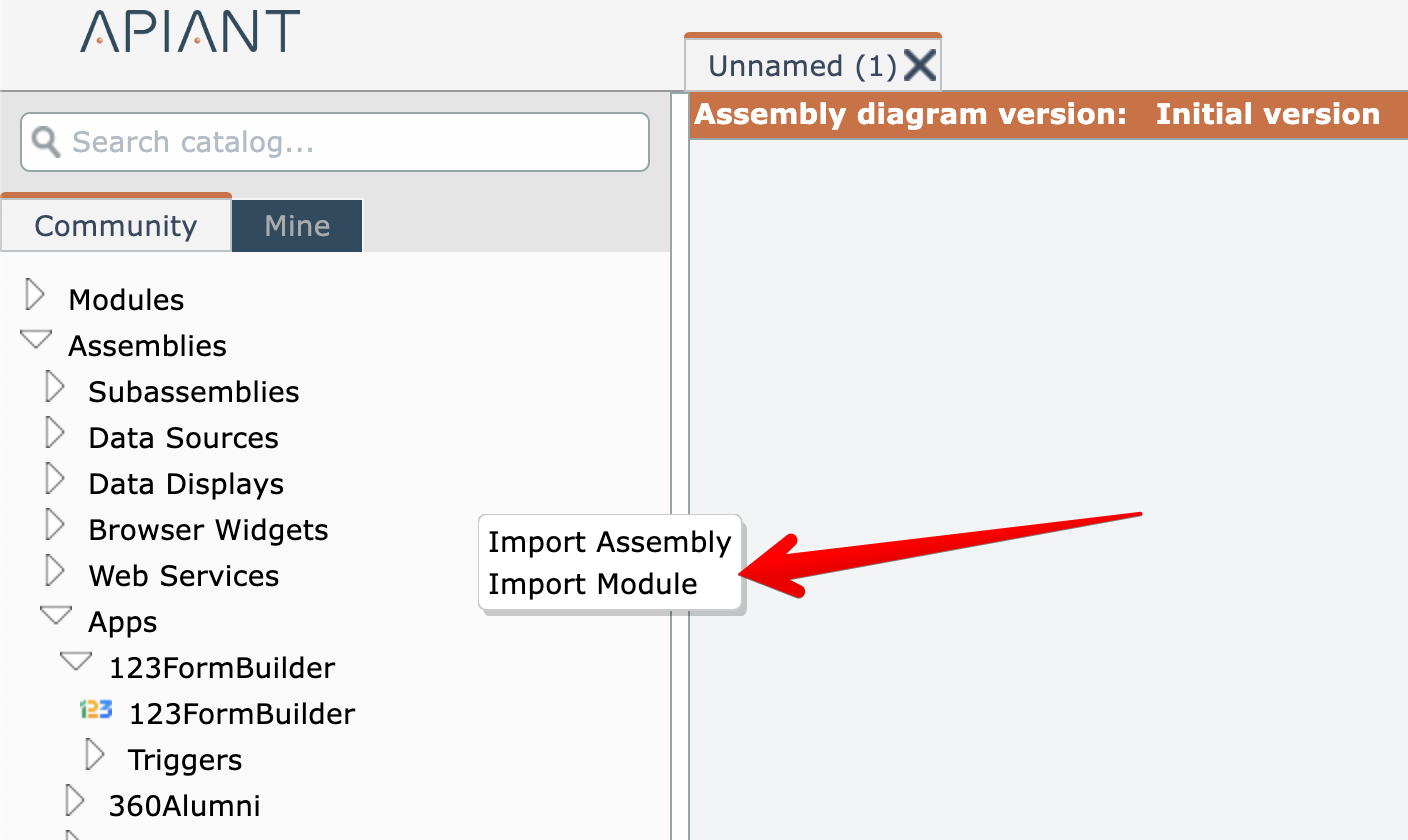 If you have a previously exported assembly or module file and if your account has the "Import" permission, you can import that item by either right-clicking on the background of the catalog or by right-clicking on the editor's background: