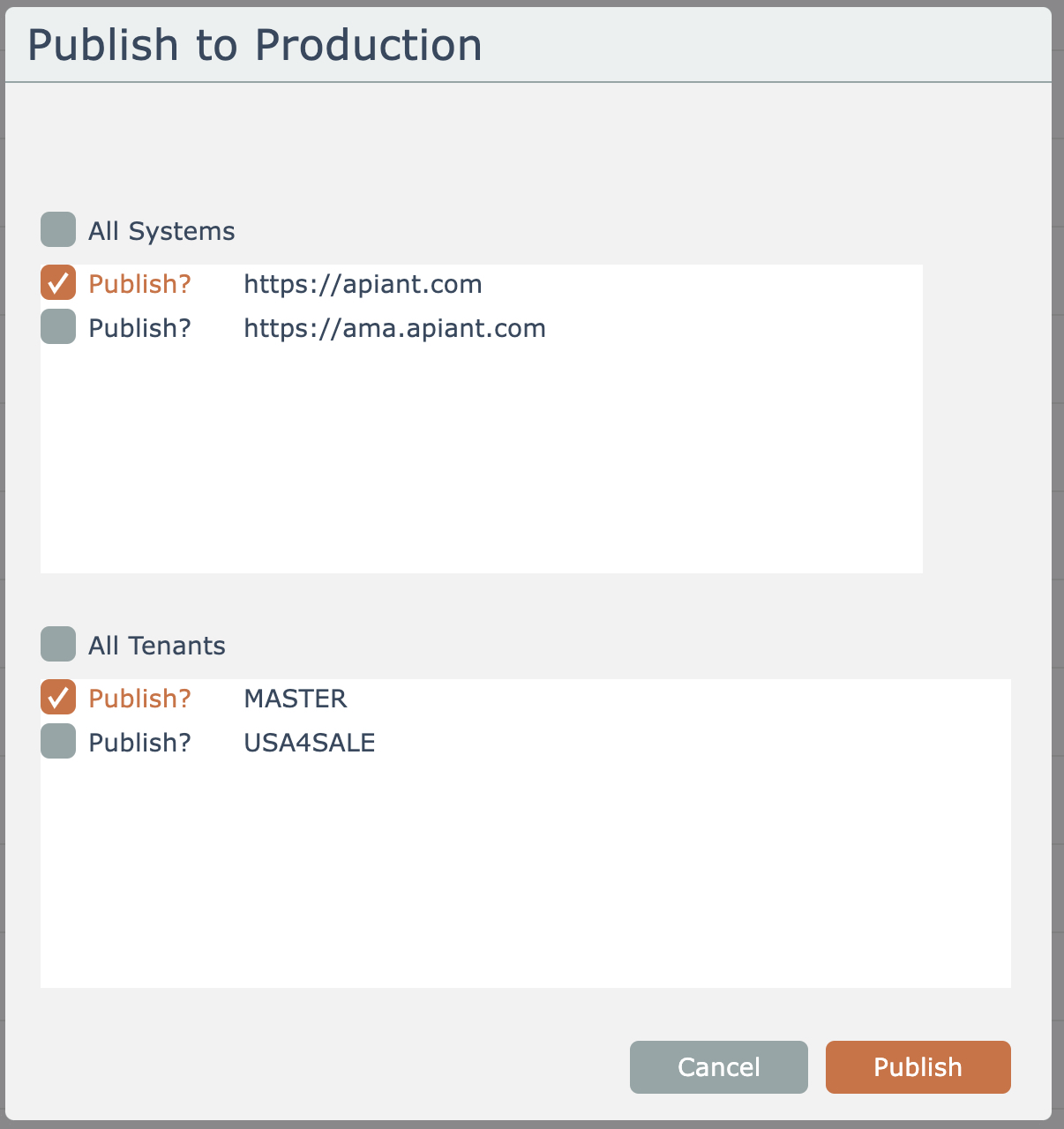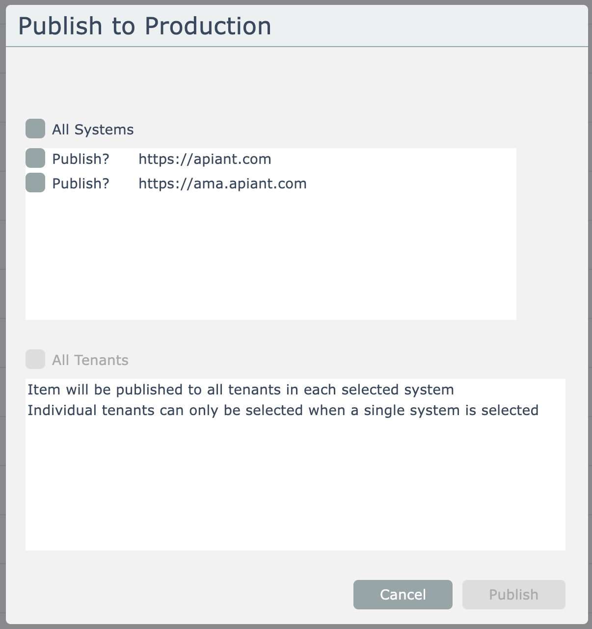 Select the destination production system(s):