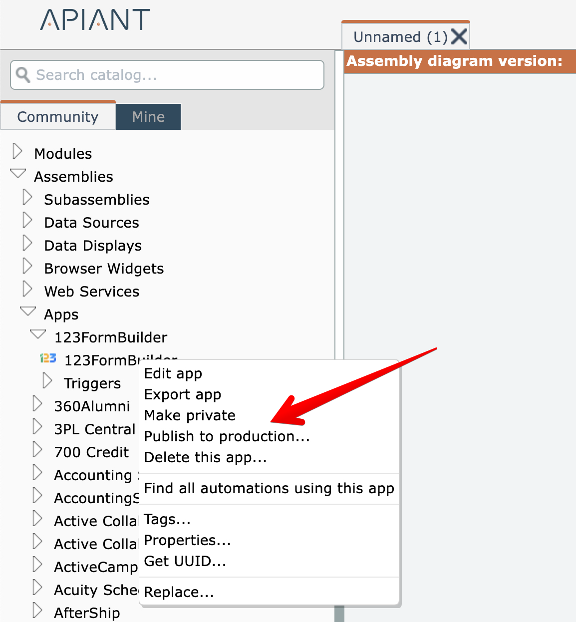 To publish an item from a development system to a production system, accounts having the "Publish to Production" permission can right-click on items in the catalog and use the Publish option: