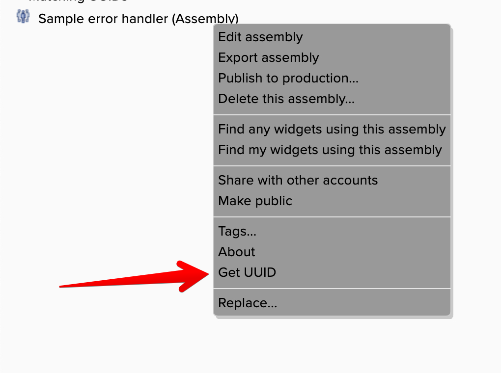 To obtain the error handler's UUID, right-click on it in the catalog and choose the Get UUID menu option: