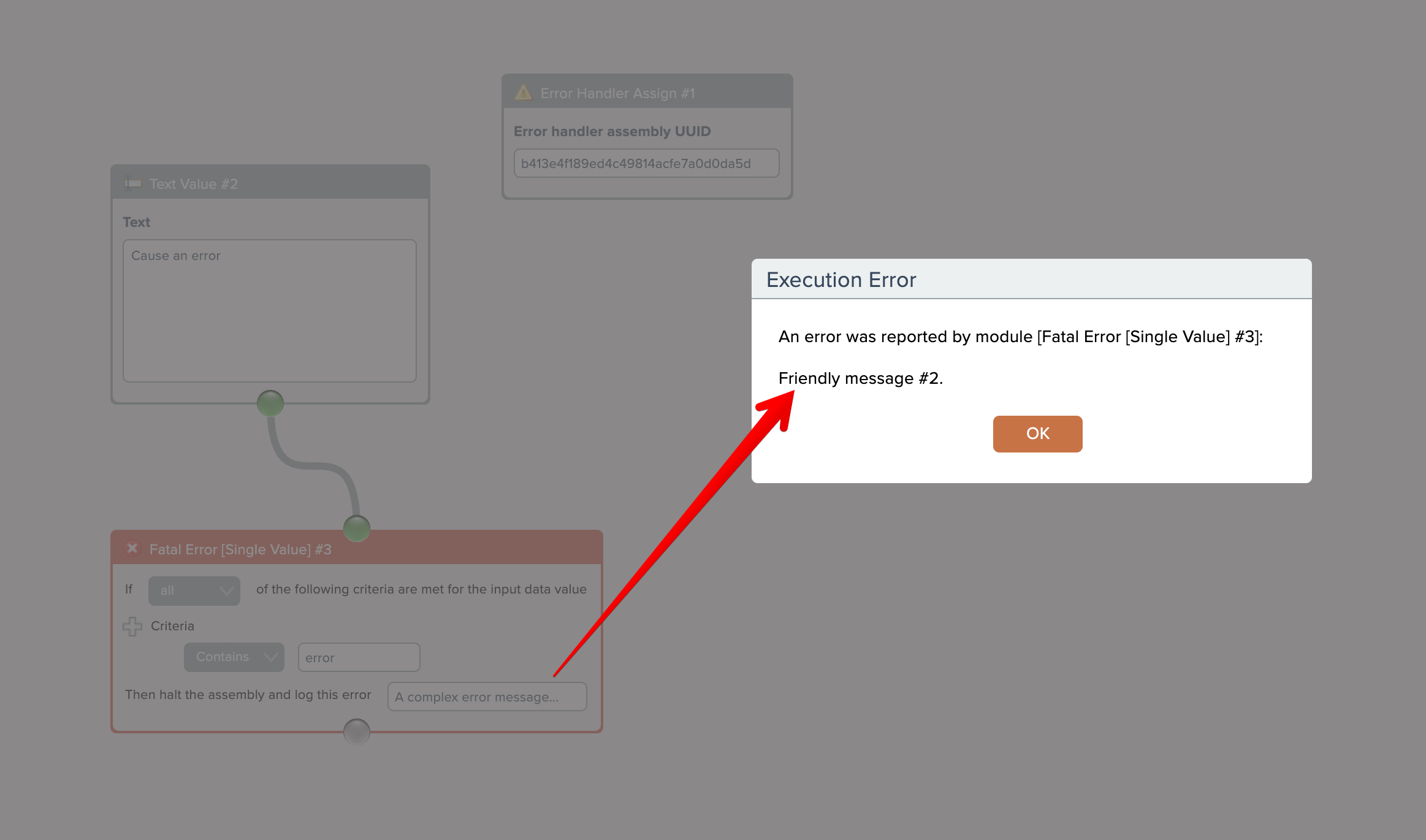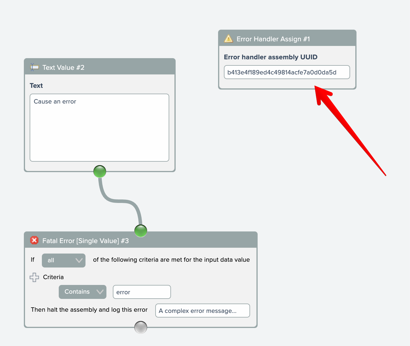 To utilize the error handler, place the Error Handler Assign module into an assembly and configure it with the UUID of the error handler assembly: