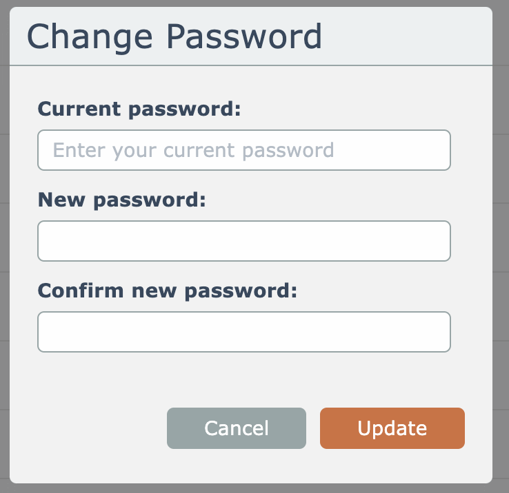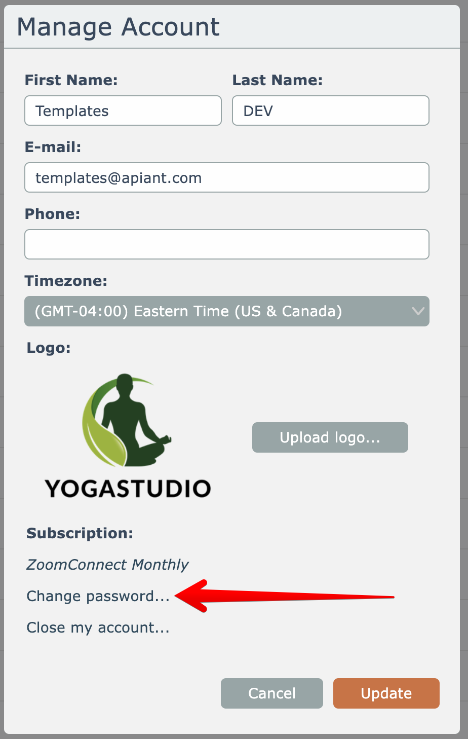 To change your password, open the Manage account menu option found under your account name menu at the top right: